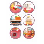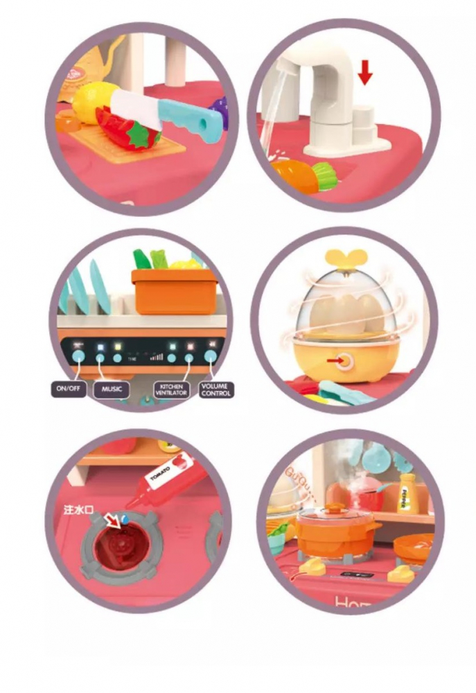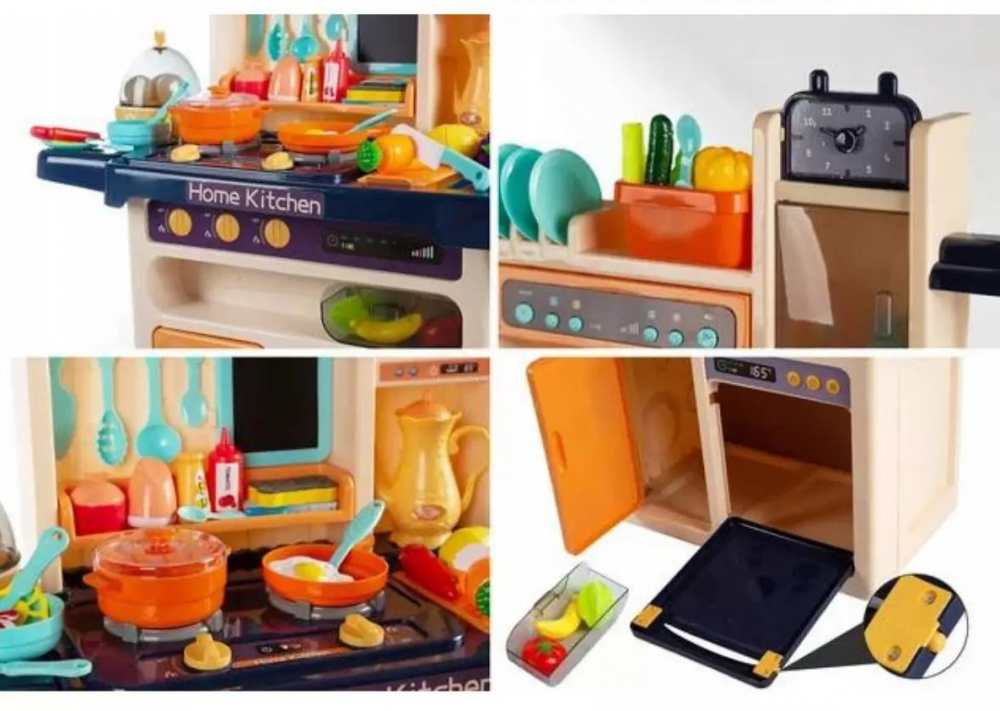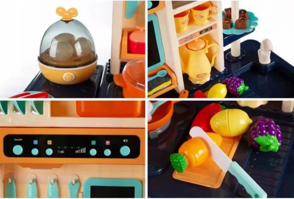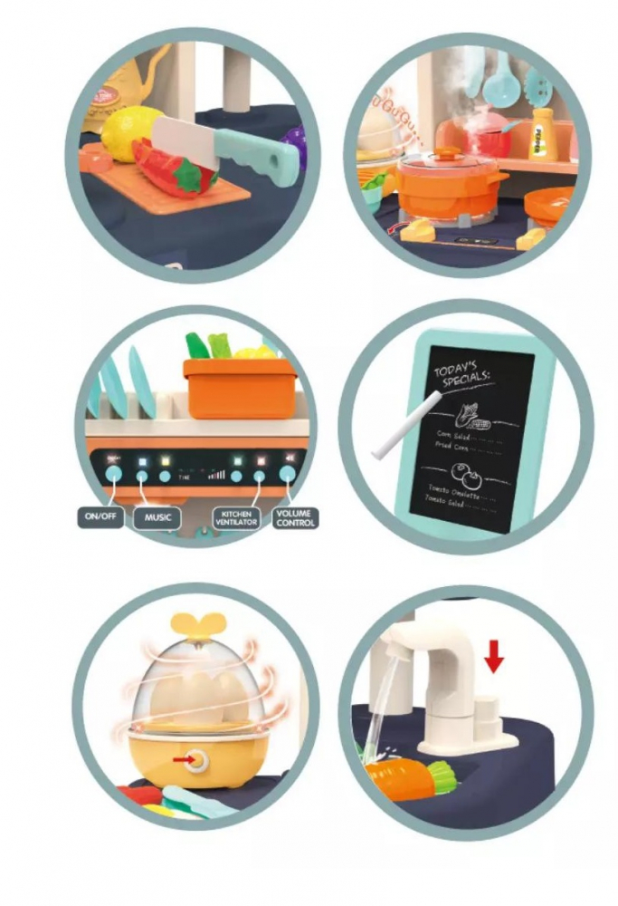 Un alt element interesant este o chiuvetă cu un robinet din care curge apă adevărată! O mică tablă cu cretă vă permite să scrieți meniul zilnic sau notițe importante. Setul include chiar și un fierbător de ouă și un frumos set de ceai!