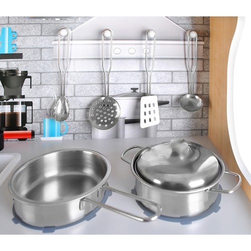 Accesorii incluse pentru Micul Bucatar: Setul contine 4 ustensile de gatit (o oala, o lingura de spaghete, o lingura cu fante si o lingura de paste), plus o oala, o tigaie si un capac.