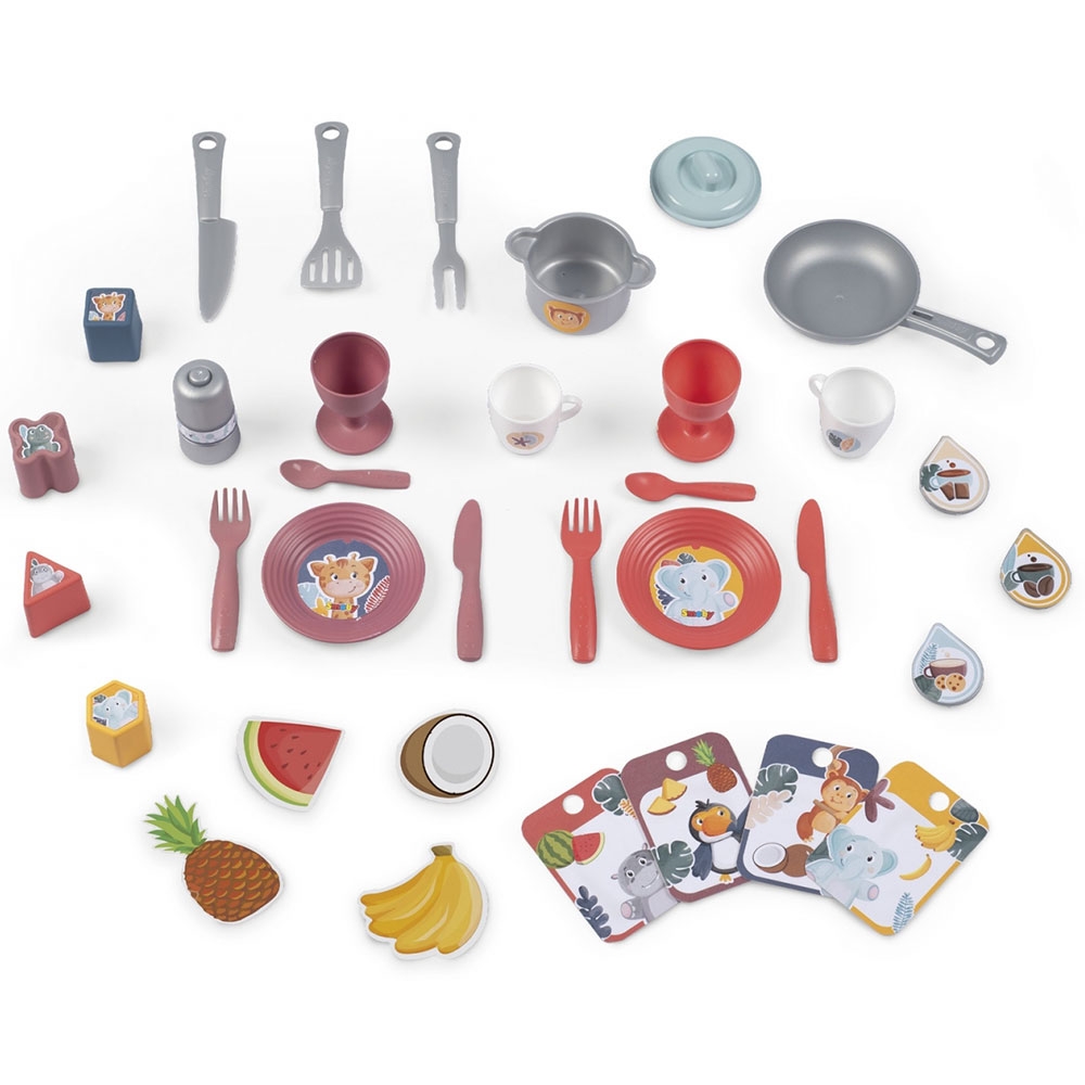 - Bucataria Smoby este dotata cu 25 accesorii interesante. Printre aceste accesorii se regasesc: aragaz, chiuveta, cuptor, tacamuri, aparat de cafea, farfurii, cani, pahare, solnita, 4 cuburi didactice de sortare si multe altele