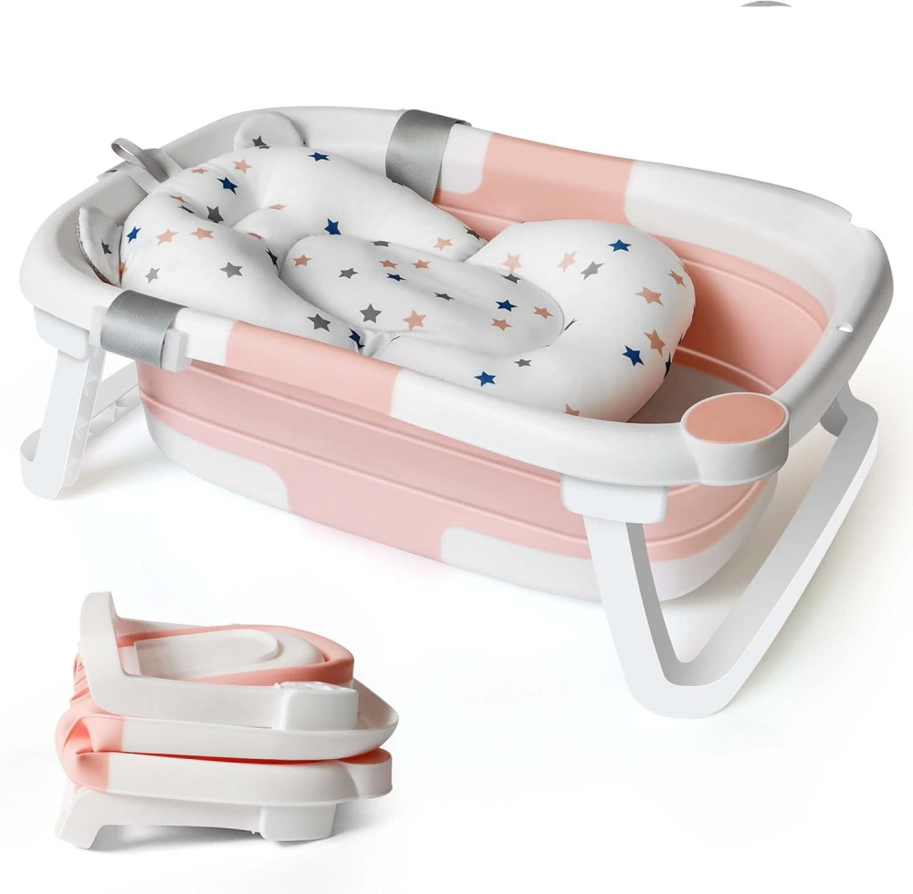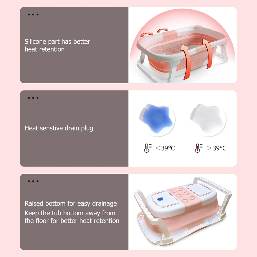 Cadita bebelusi ultrapliabila Little Mom Pink, cu pernuta moale plutitoare, termometru incorporat, display digital, cu dop pentru evacuarea apei, suport cap de dus, antiderapant, material Non-Toxic