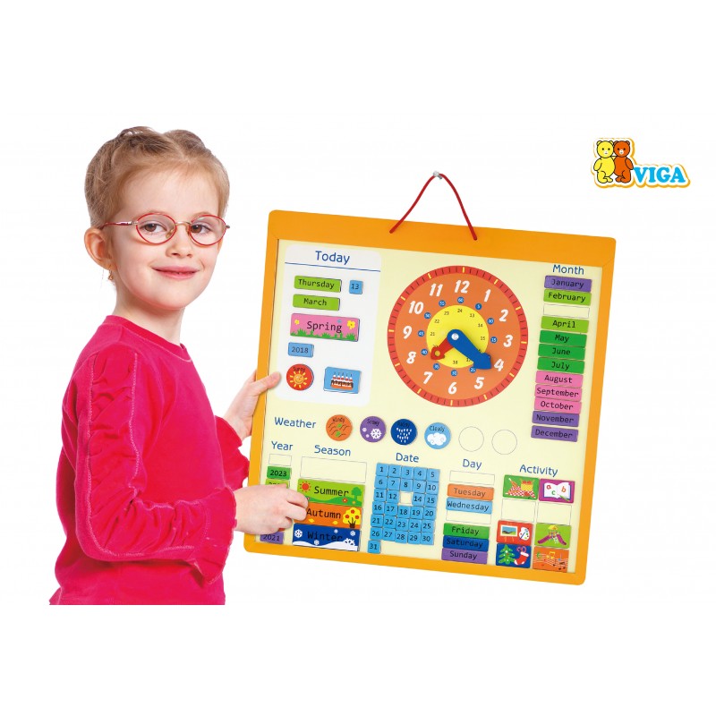 Include 75 de piese magnetice care faciliteaza intelegerea conceptelor de timp, data, zile, luni, sezoane, ani, vreme si activitati.
