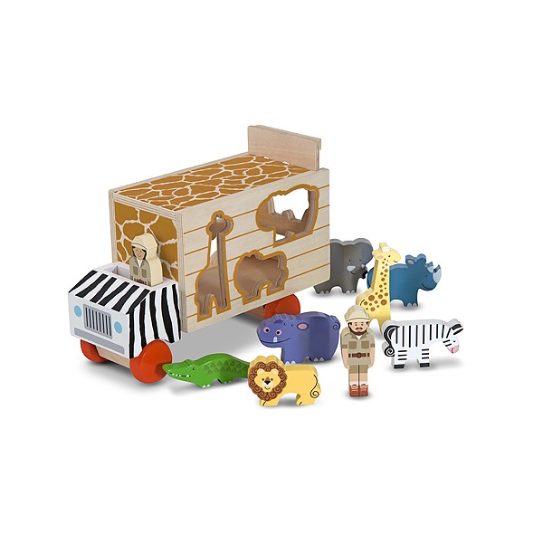 * Setul contine un camion cu forme de sortat reprezentand animale (crocodil, zebra, rinocer, elefant, girafa, hipopotam si leu) si 2 personaje.