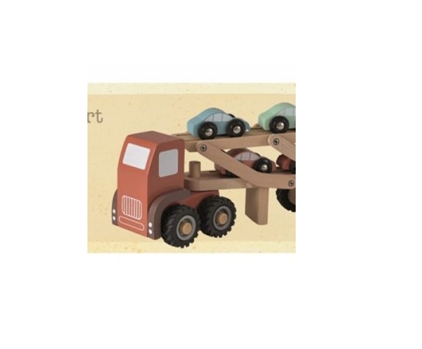 Camion robust din lemn, pentru transport auto, cu 4 mașinuțe din lemn.