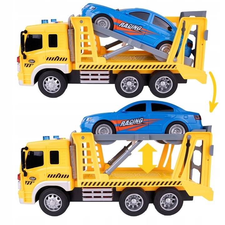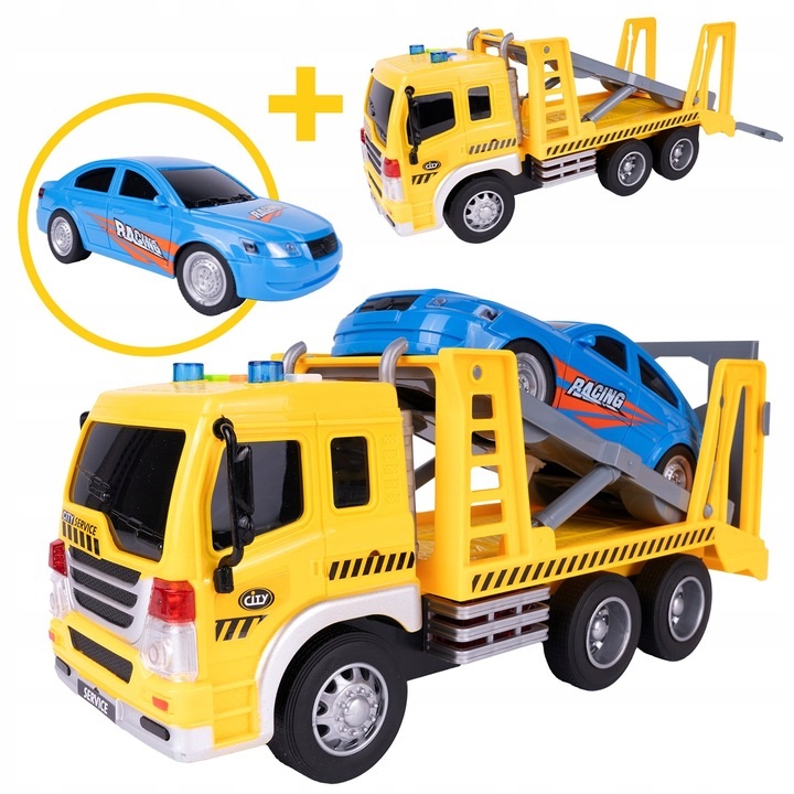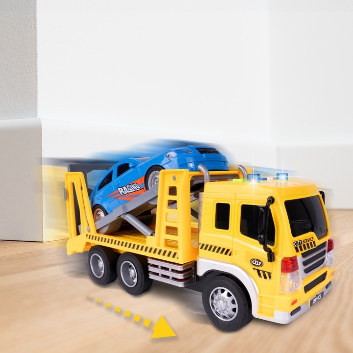 Camion de remorcare pentru copii Malplay, cu lumini sunete si masinuta inclusa 1:16 Service Yellow/Blue