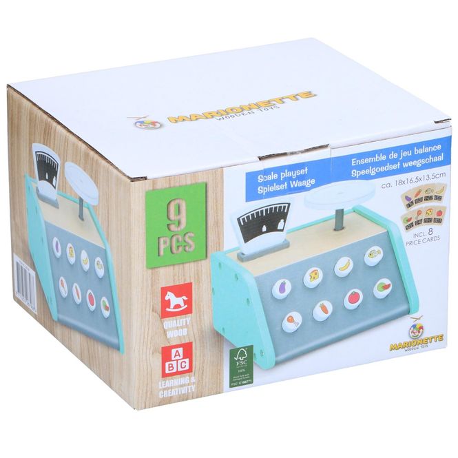 Cântarul vine cu 8 cartonașe din lemn care înfățișează diferite produse alimentare cu greutăți marcate.