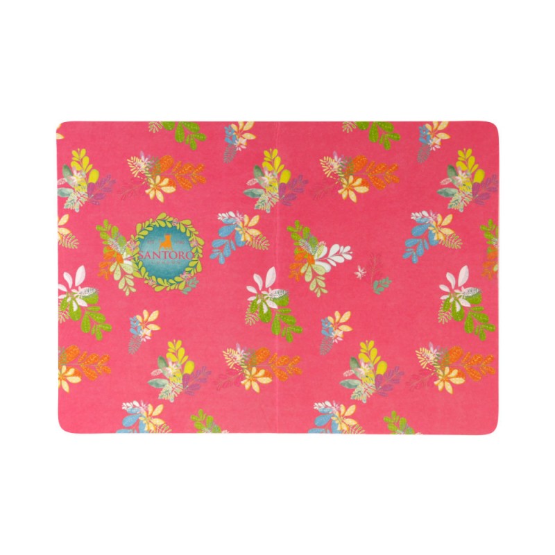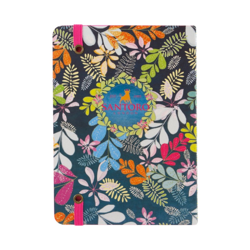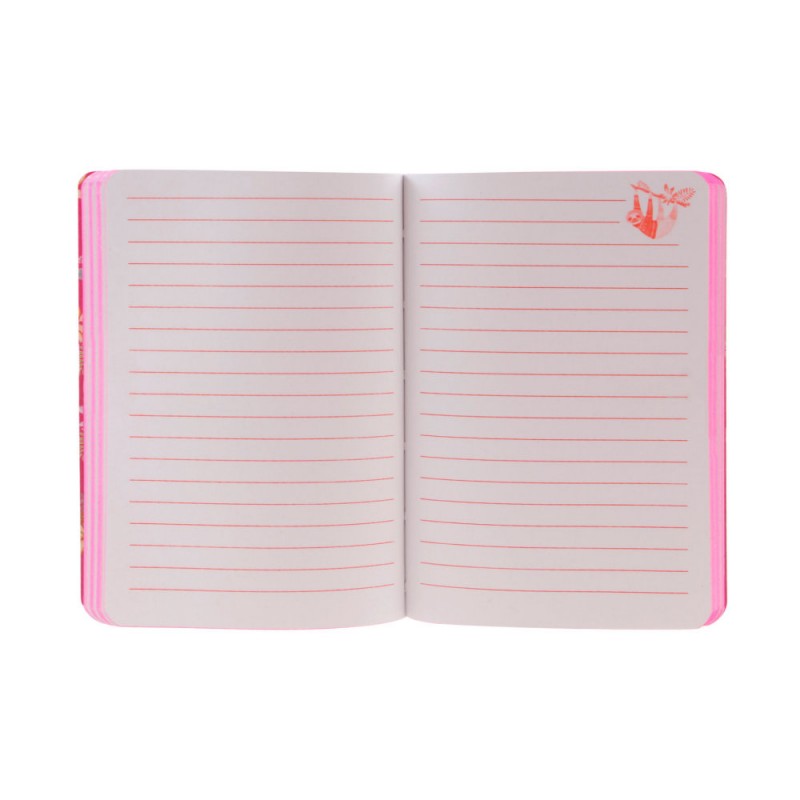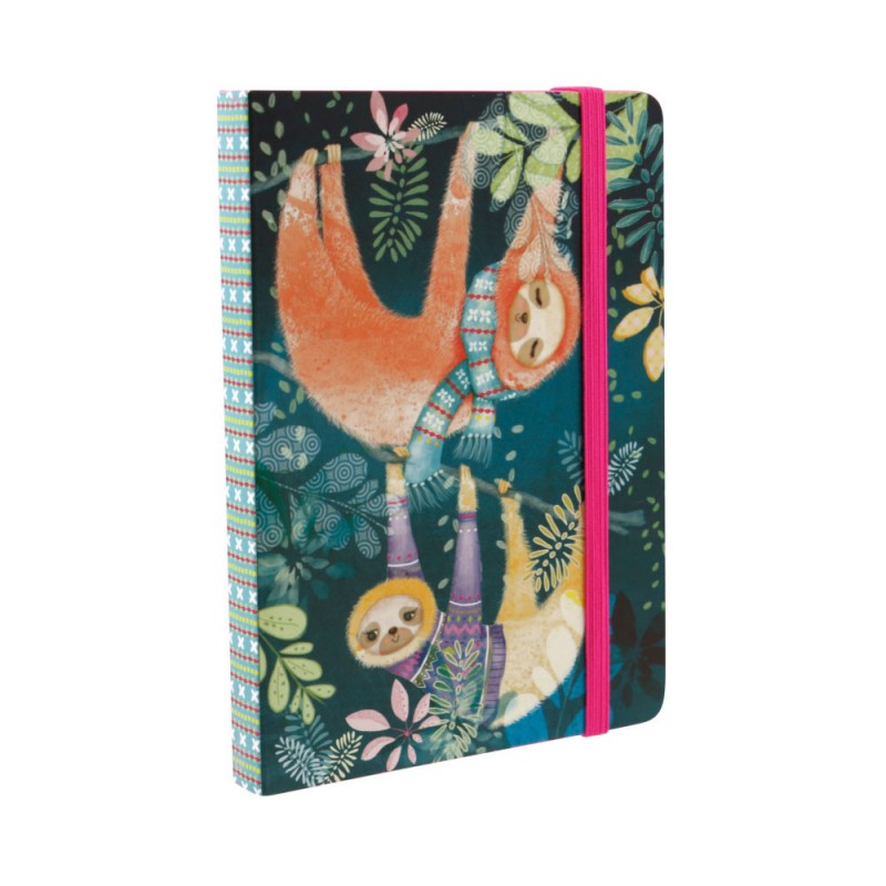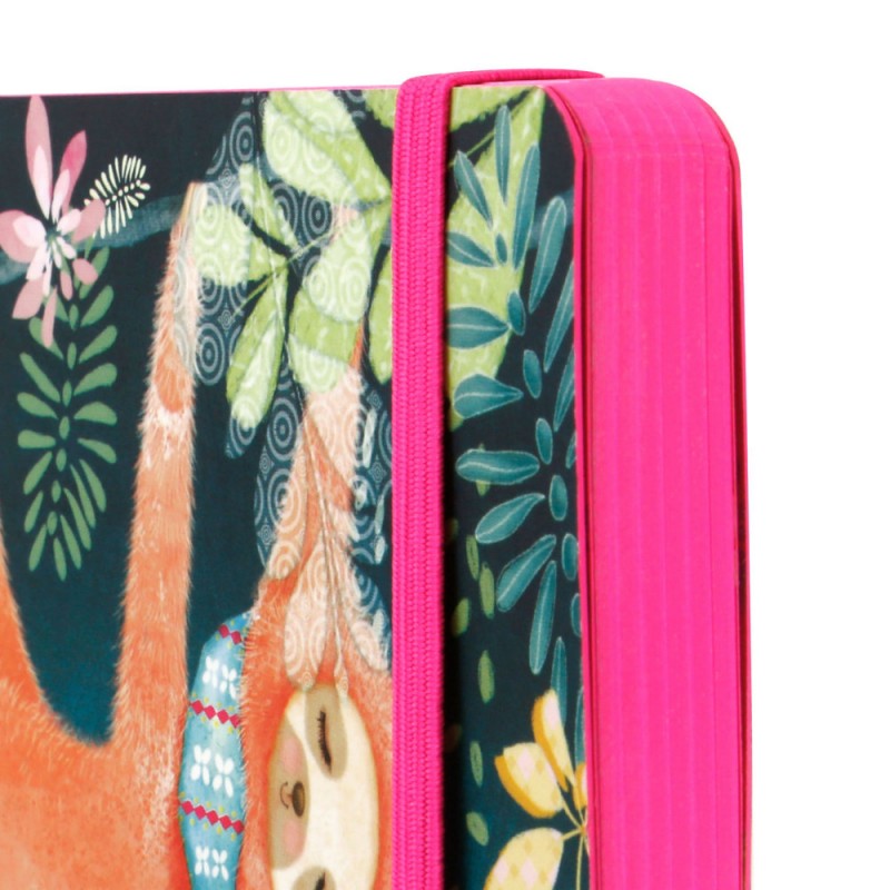 Carnetel A6 Santoro - Sloths cu imprimeu haios avandu-l in prim plan pe simpaticul lenes. Unul dintre cele mai indragite animale, lenesul decoreaza coperta din fata cocotat pe ramurele colorate. Partea din spate are un fundal turcoaz acoprit de o multime de crengi colorate diferit ce incadreaza logo-ul Santoro. Pe interior, ambele coperti sunt viu colorate. Marginile acestui carnetel au o frumoasa culoare de zmeura, la fel si snurul elestic cu care se inchide.