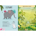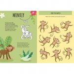 • Cartea contine: pagini de colorat cu tigri, maimute, papagali, elefanti si alte animale exotice, care dezvolta simtul estetic si creativitatea, labirinturi captivante si provocatoare, menite sa imbunatateasca gandirea logica si spiritul de observatie, jocuri de logica, 60 de abtibilduri viu colorate, perfecte pentru decorat si completat activitatile din carte si multe informatii amuzante si educative despre vietuitoarele din jungla – prezentate intr-un mod simplu si accesibile copiilor