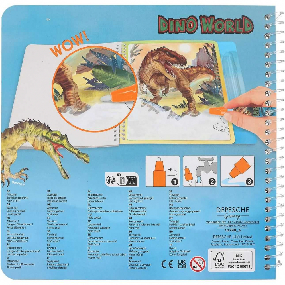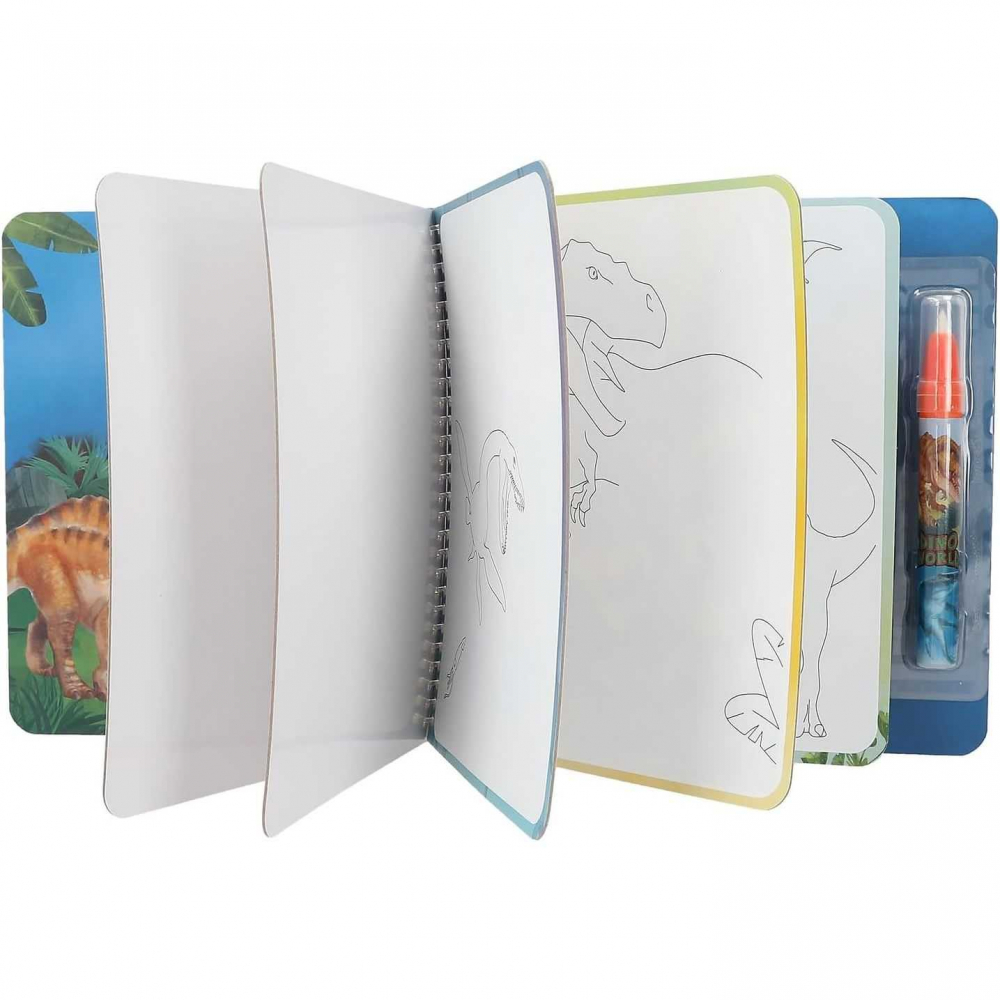 - 5 pagini reutilizabile – fiecare pagina dezvaluie motive ascunse de dinozauri atunci cand este umezita si revine la starea initiala dupa uscare.