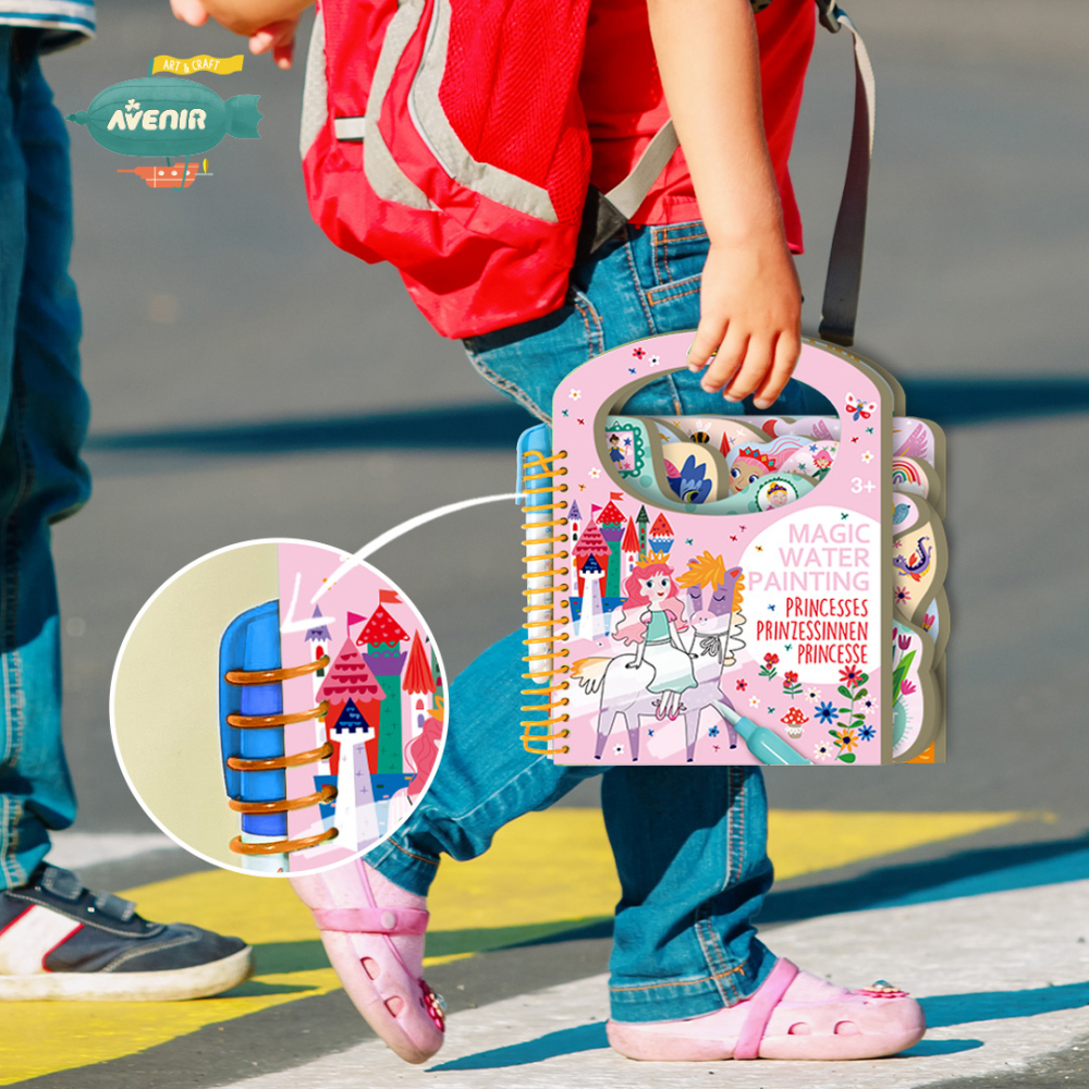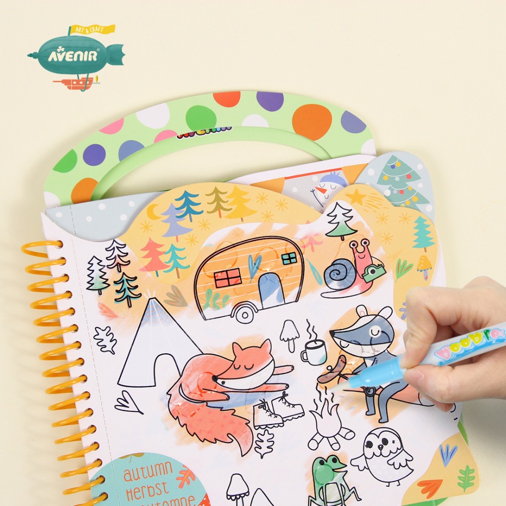 Fiecare carte include 6 suprafețe de colorat reutilizabile și două foi de autocolante repoziționabile cu activități tematice și un stilou cu apă reîncărcabil.