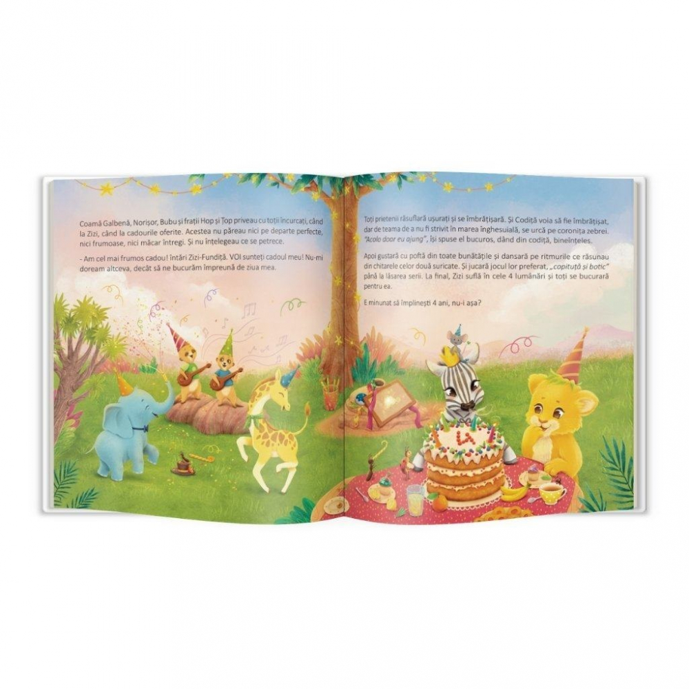 Langa un copac falnic din mijlocul savanei, isi avea casa o fetita zebra. Era Zizi-Fundita? cea vesela si jucausa. Numele ii venea de la fundita din piept care se impletea din dungile ei, de fiecare data cand era fericita. Si asa i-a ramas numele. Pentru ea, azi era o zi speciala: implinea 4 anisori si tocmai pregatea o mare petrecere. Ce bucurie! Si-a invitat toti prietenii si nu era timp de pierdut.