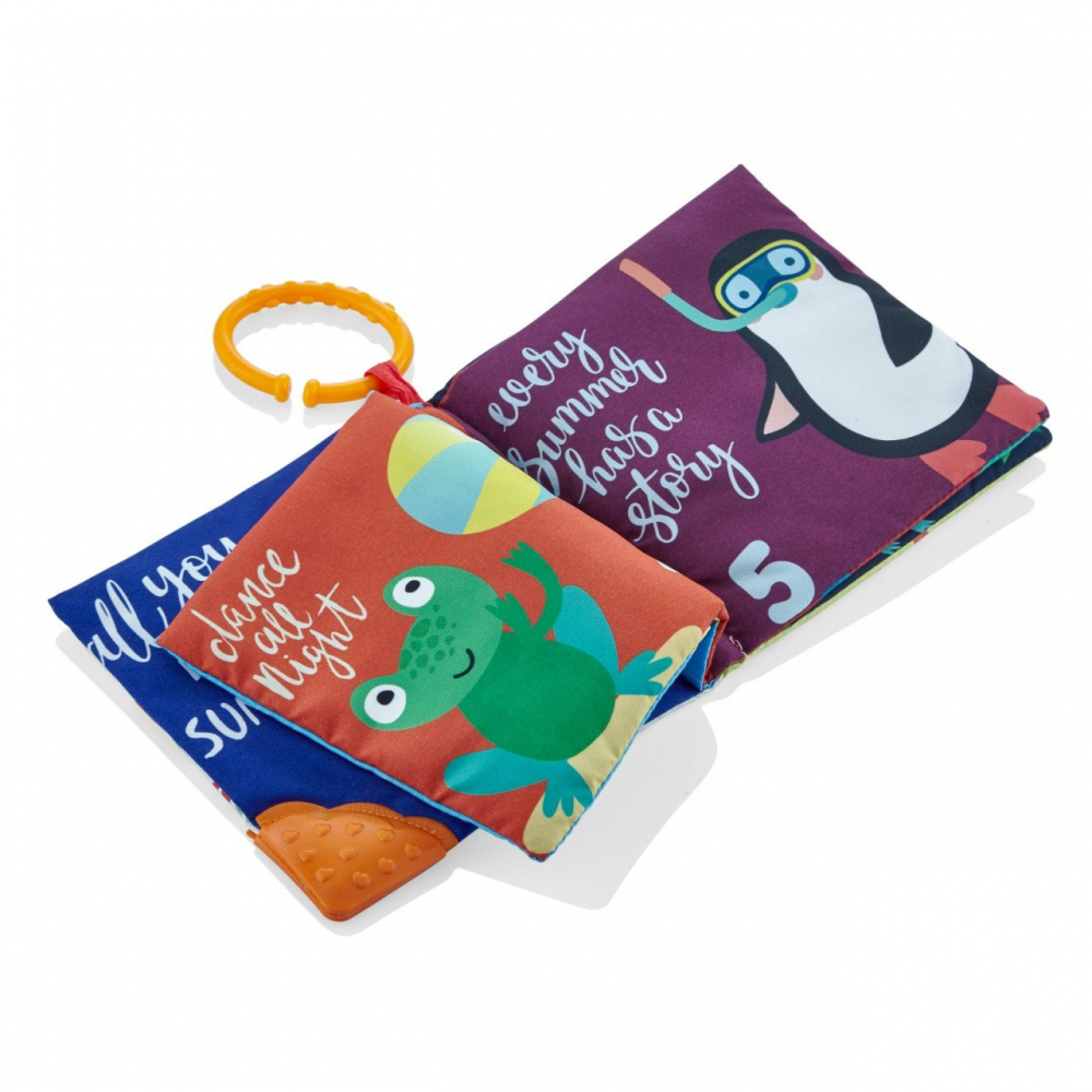 - cartea este prevazuta cu 3 pagini care fosnesc si viu colorate cu diferite personaje si animale. In coltul primei pagini se afla o jucarie de dentitie ce ajuta copilul la calmarea gingiilor.
