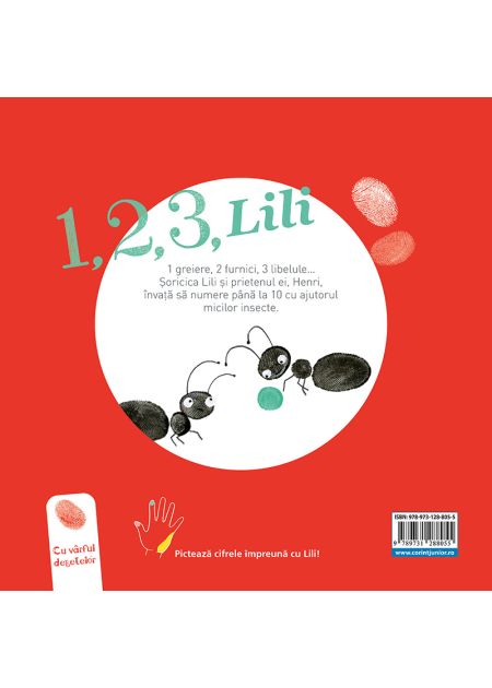 1 greiere, 2 furnici, 3 libelule… Șoricica Lili și prietenul ei Henri numără până la 10 cu ajutorul unor insecte mici. Cu un strop de umor și multă poezie, copiii vor învăța să numere și vor descoperi lumea înconjurătoare (purici, păianjeni, omizi și gândaci).