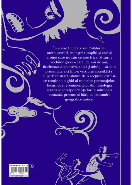Miturile vechilor greci – care, de mii de ani, fascinează deopotriva copii și adulți – vă sunt prezentate aici într-o versiune accesibilă și superb ilustrată, alături de o secțiune extinsă ce conține un ghid al numelor personajelor, locurilor și evenimentelor din mitologia greacă și corespondența lor în mitologia romană, precum și hărți cu denumiri geografice antice.