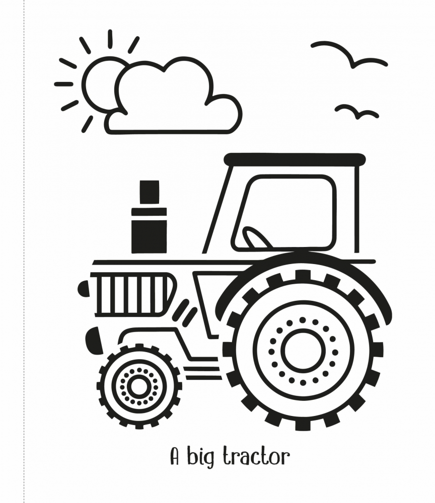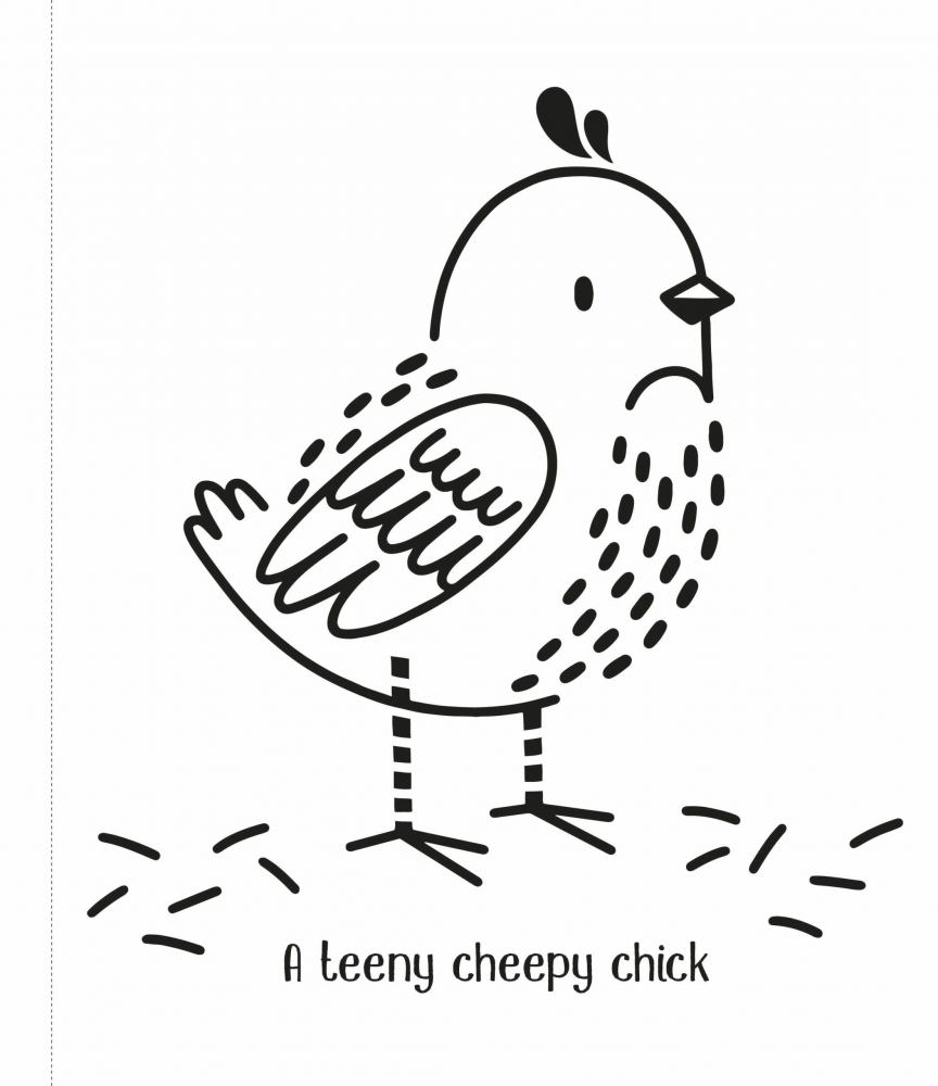 Este suficient să dai cu apă peste desenele alb-negru pentru a vedea cum un tractor, o sperietoare de ciori zâmbitoare și un pui vesel prind culoare.