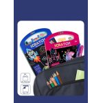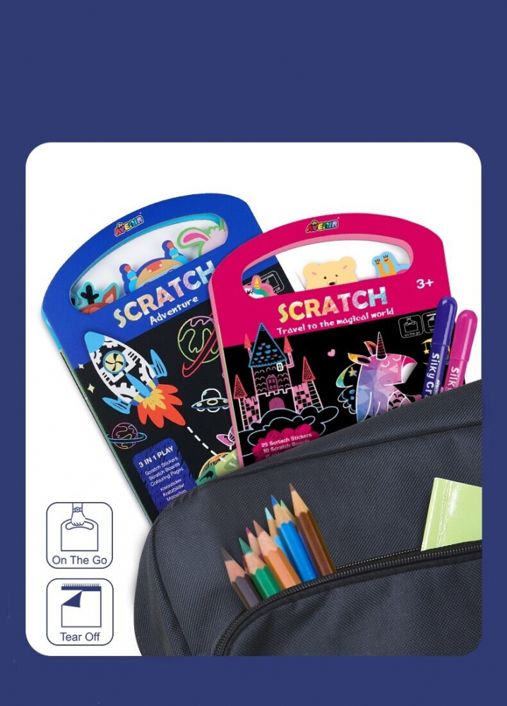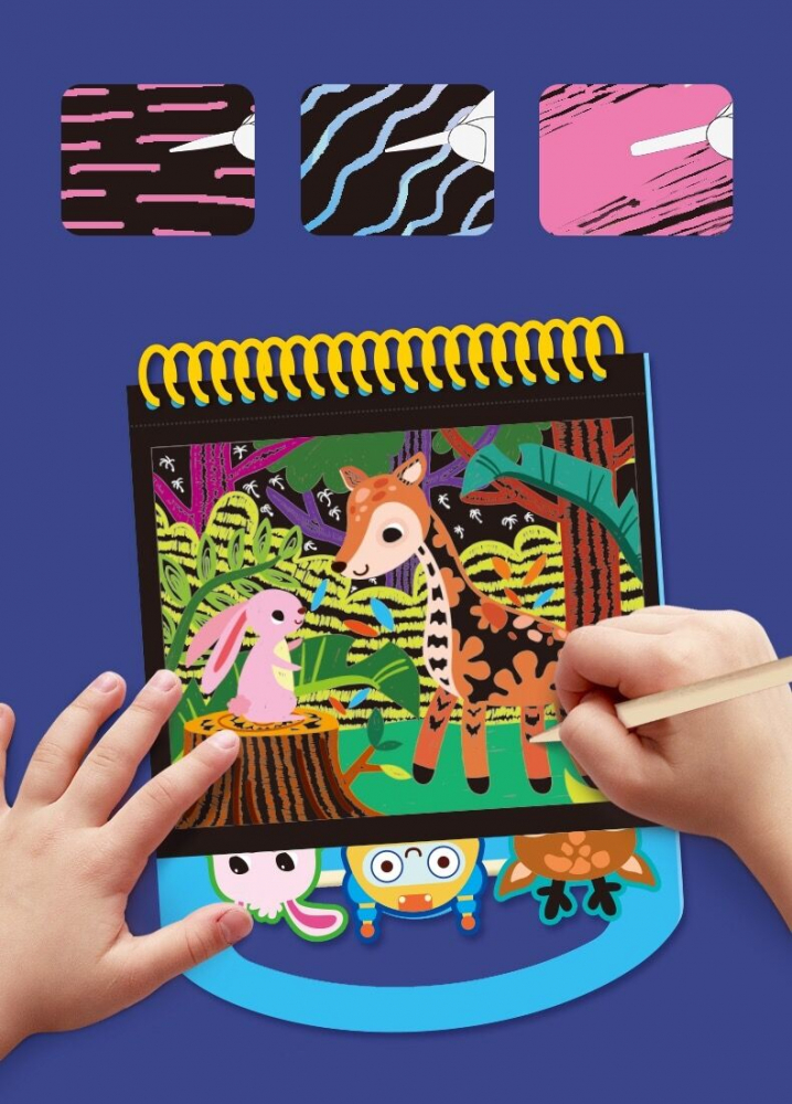 Copiii pot face bricolaj cu foi de razuit pre-perforate, autocolante pentru razuit si, de asemenea, activitati distractive de colorat.
