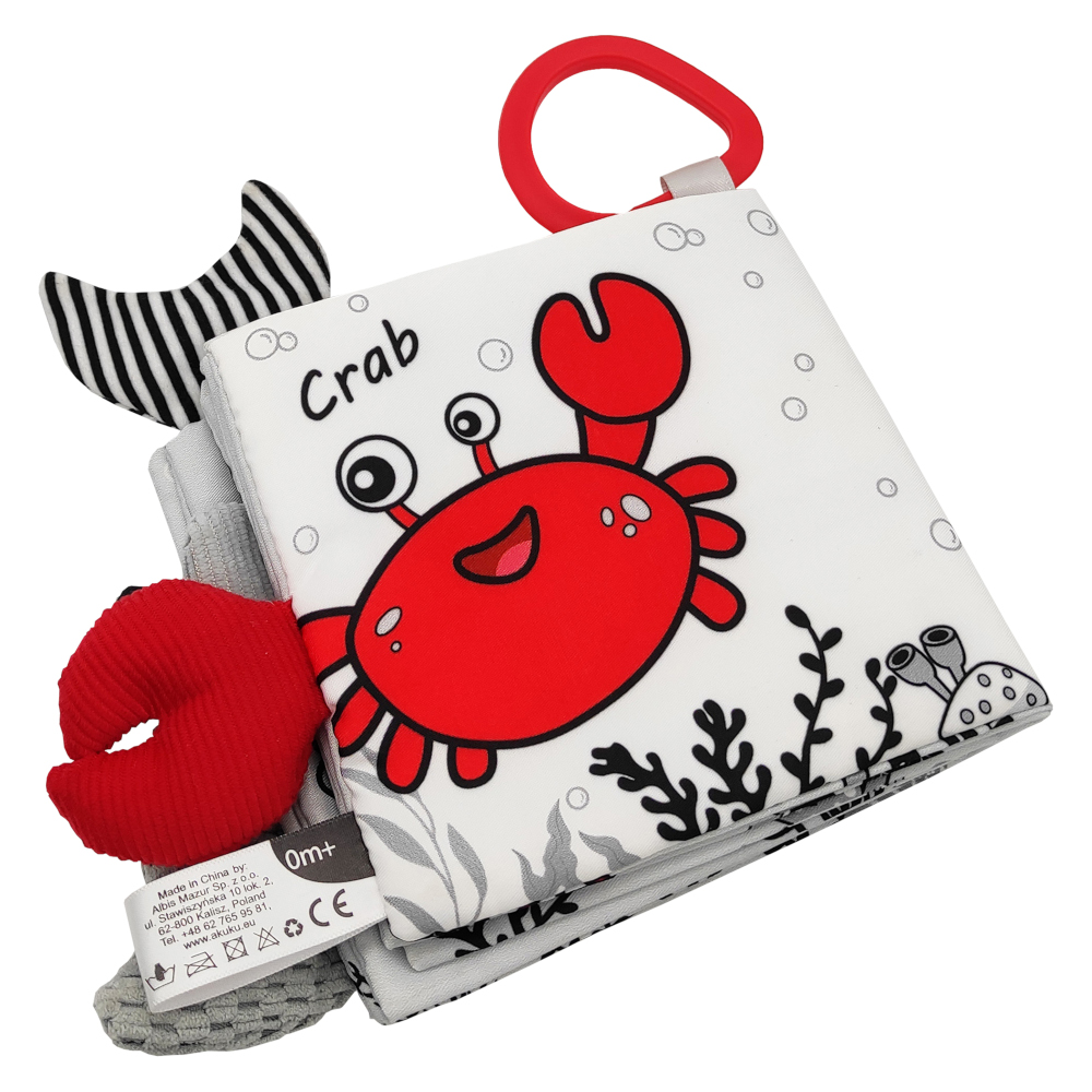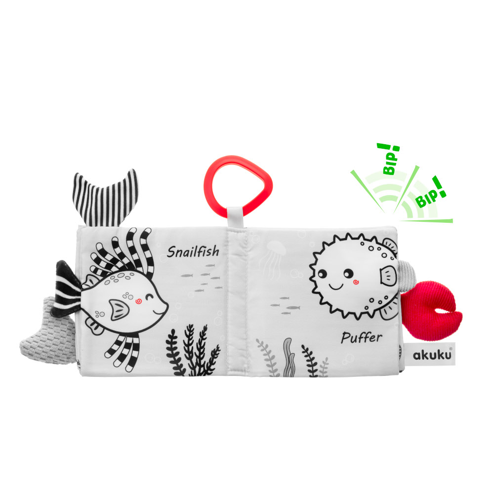Carte senzoriala pentru bebelusi Akuku Marine Animals 12x12 cm,contine elemente fosnaitoare si zornaitoare, stimuleaza coordonarea vizuala, auditiva si motorie fina,clema pentru atasare la carucior/scaun auto/patut