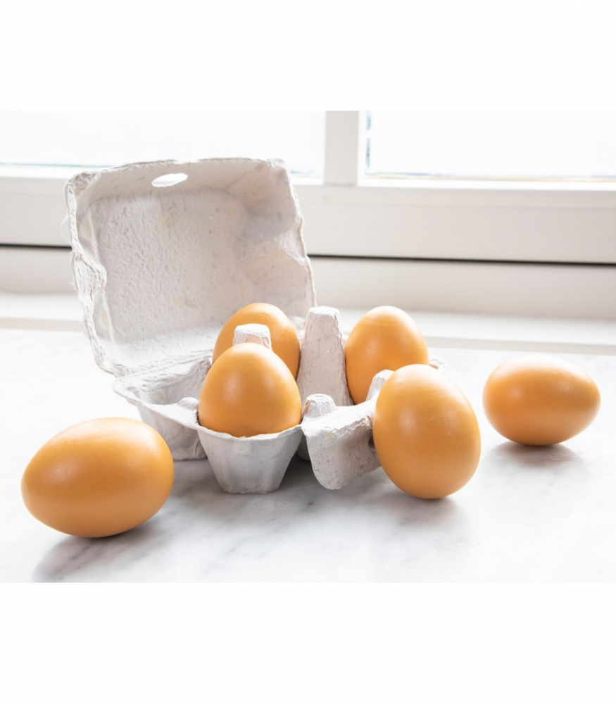 Șase ouă de jucărie din lemn într-o cutie de ouă realistă. Perfect pentru bucătarii în devenire. Acest articol face parte din gama de produse New Classic Toys „Bon Appetit”.