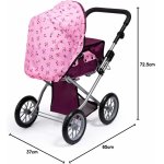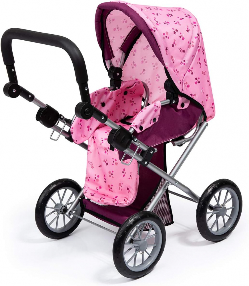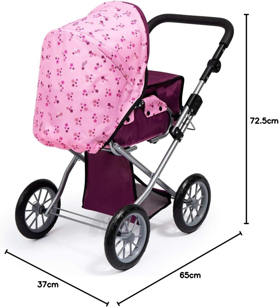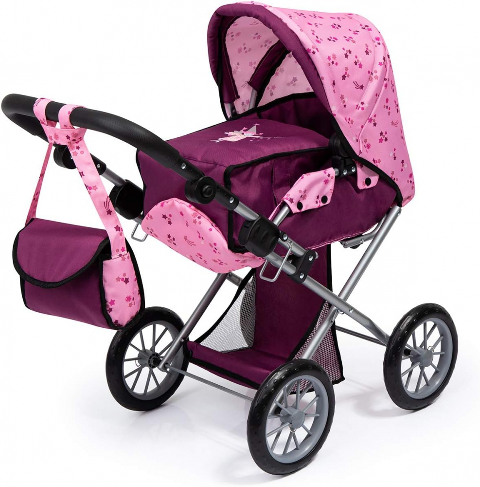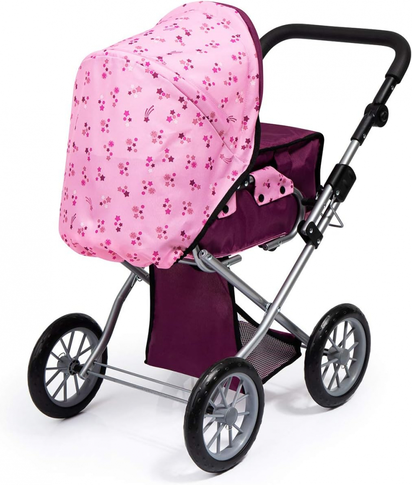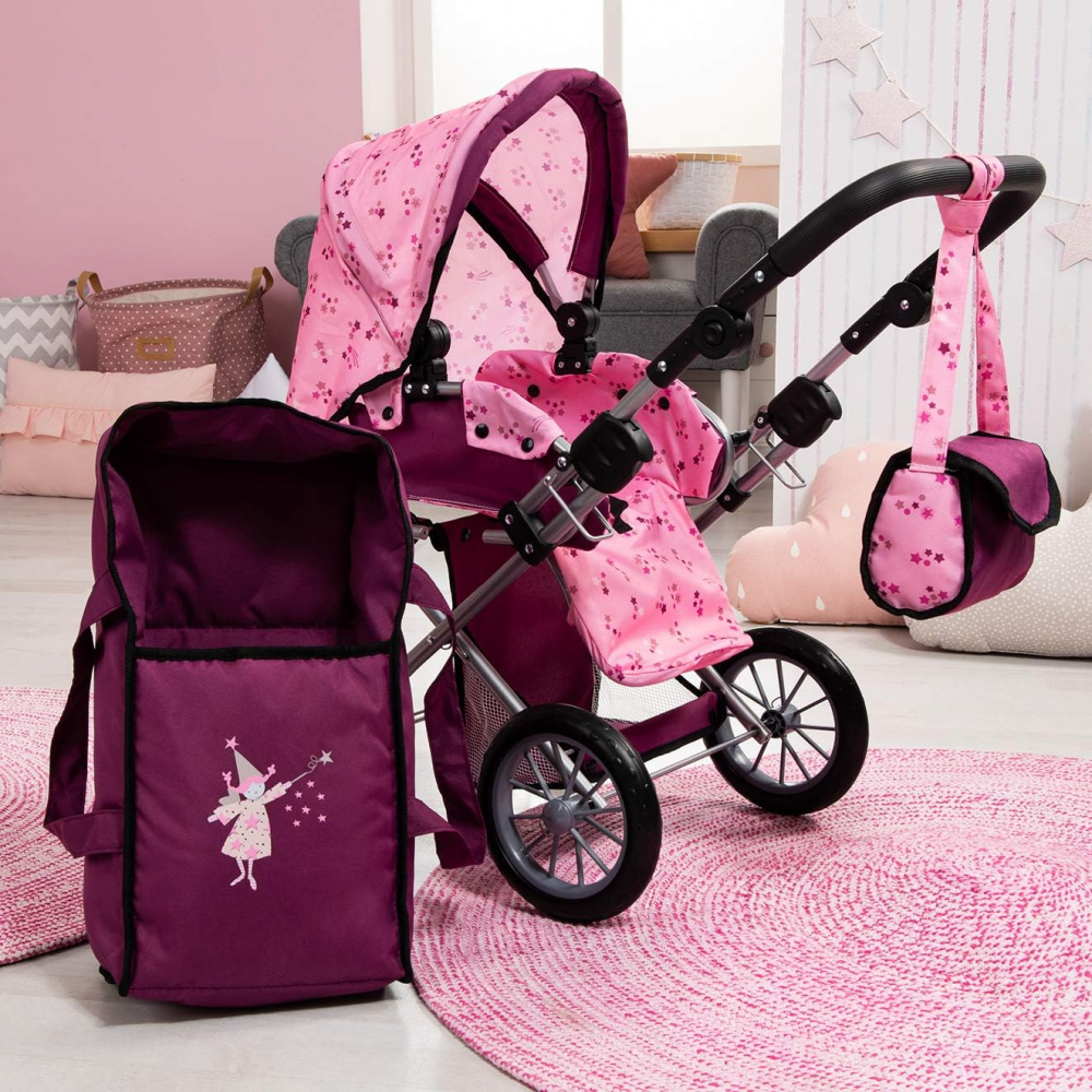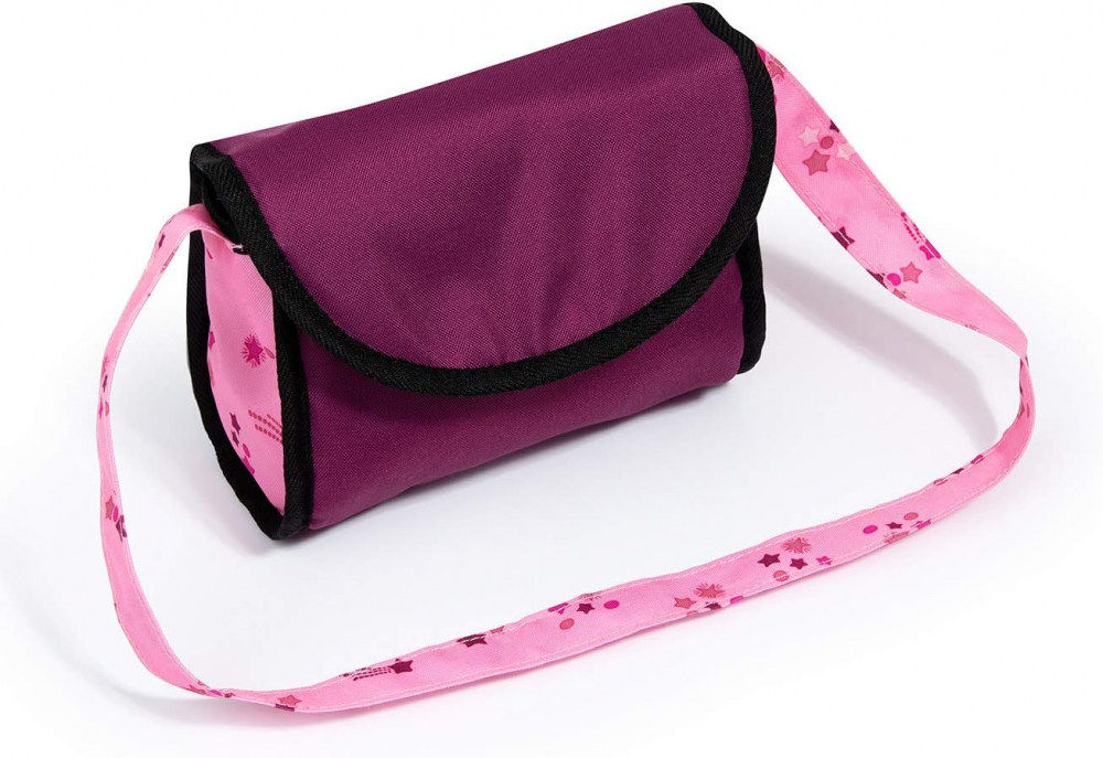 Carucior 2in1 pentru papusi Bayer City Star Plum cu maner reglabil pana la 65cm,portbebe si gentuta de umar,cadru metalic pliabil compact,potrivit pentru papusi pana la 46 cm,dimensiune 72,5x37x65 cm