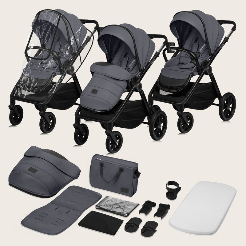 Carucior 3 in 1 Lionelo Layla Sarcina maxima 22 kg, Cadru aluminiu, Cu landou intarit si salteluta din spuma AirDots, Reversibil, Cu ventilatie 3D, Cu accesorii, Standard de siguranta EN1888-1 gri