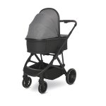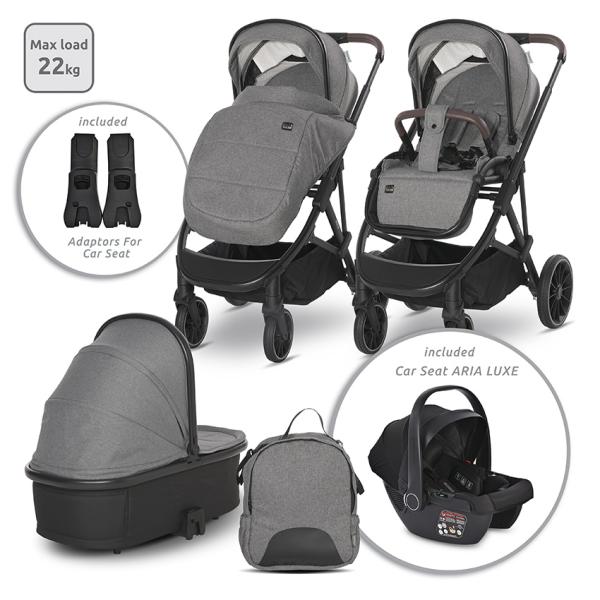 Carucior 3 in 1 pentru copii Lorelli Aria Grey, cosulet auto Aria Luxe 40-87 cm inclus, cadru din aluminiu, parte sport reversibila, multiple accesorii, greutate admisa 22 kg