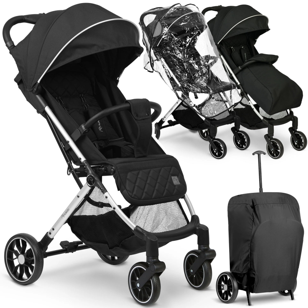 Carucior cu pliere compacta pentru copii cu suspensii,spatar reglabil,bara de protectie detasabila,capotina cu protectie UV,husa de transport,husa picioare si husa ploaie,dimensiuni compatibile avion Nukido Paseo Negru