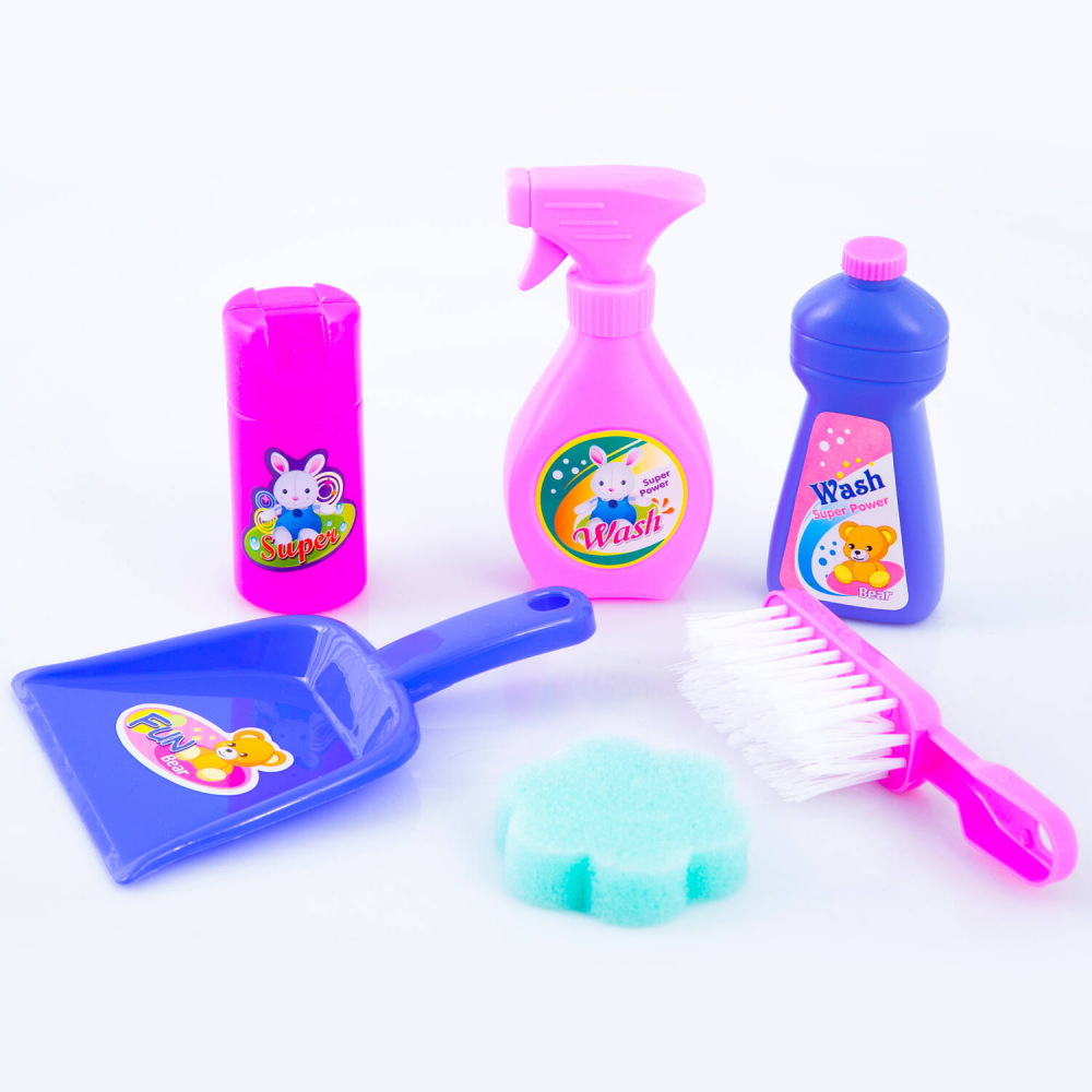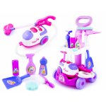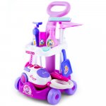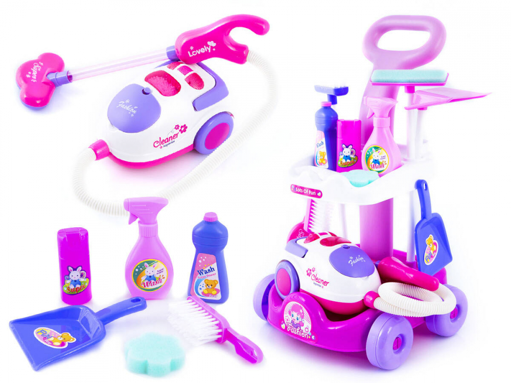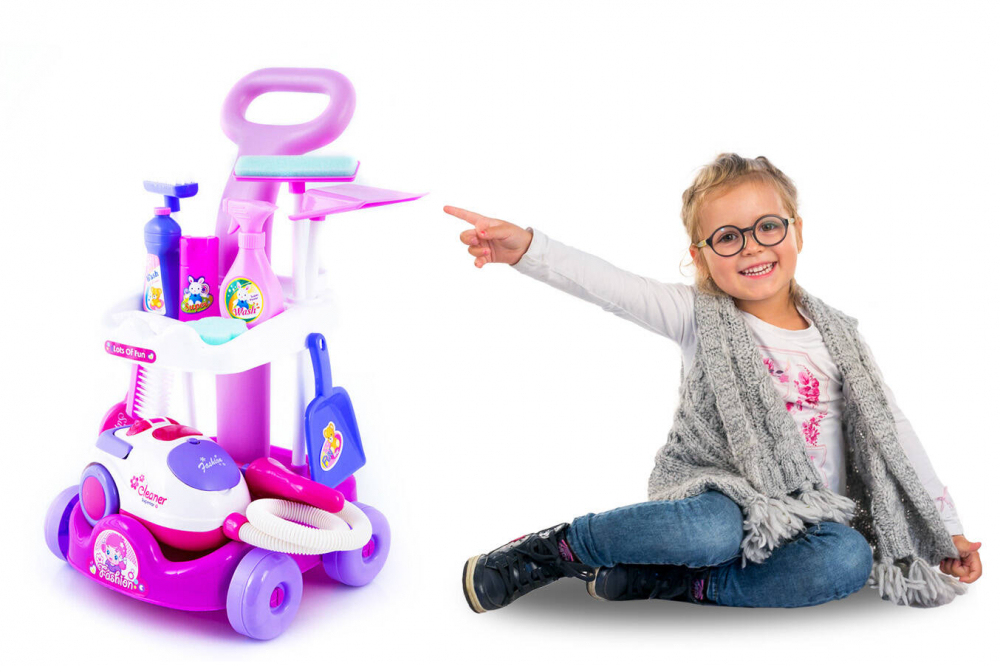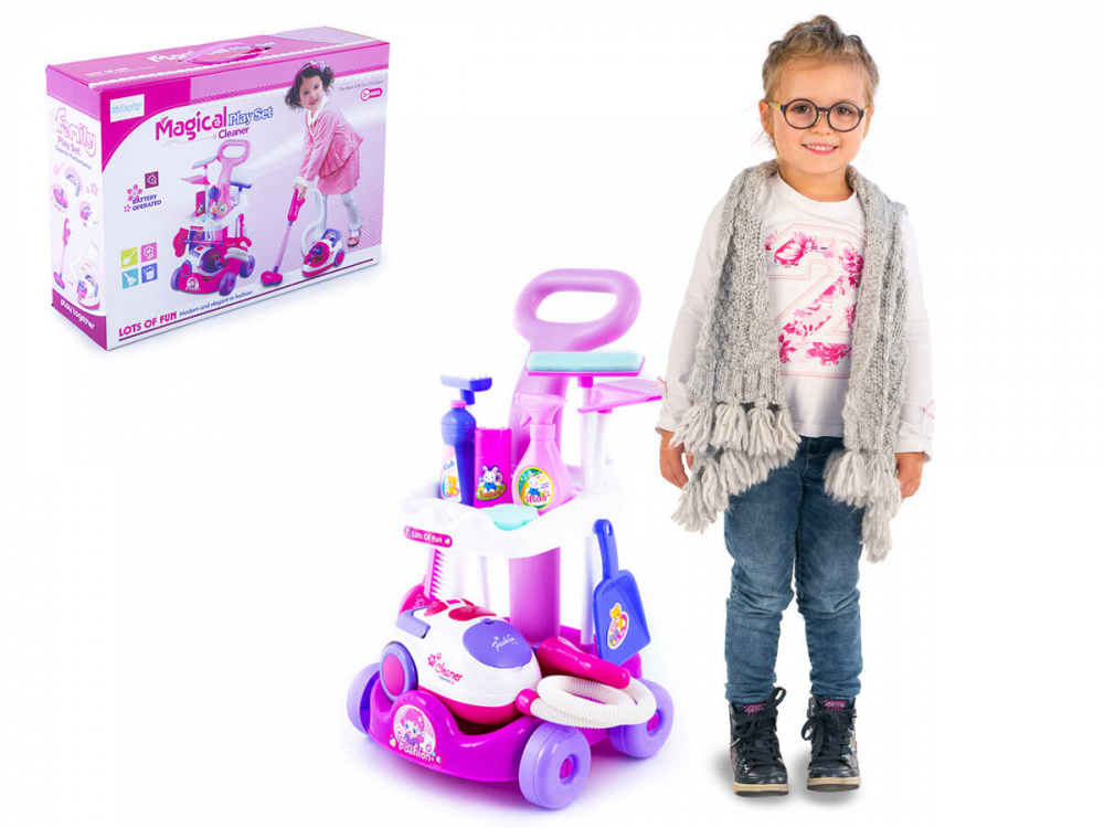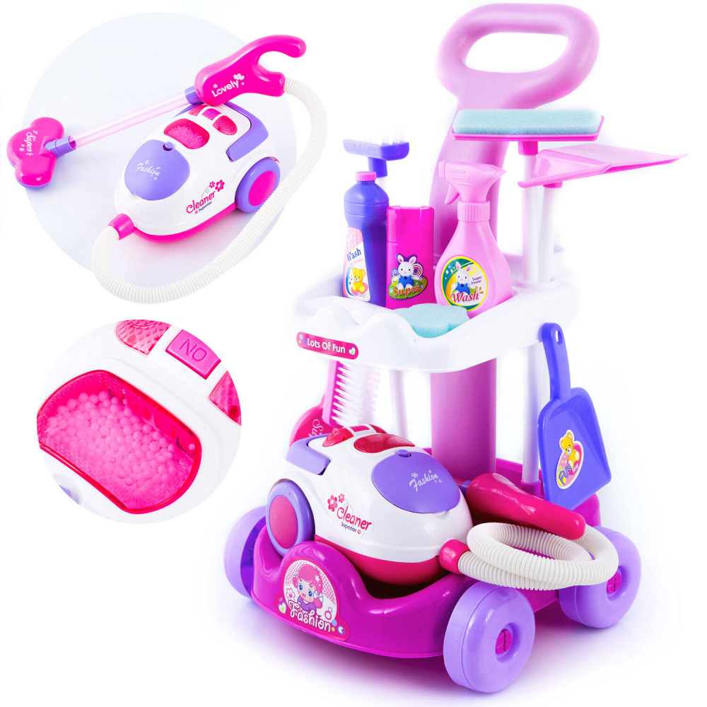 * Un carucior minunat de curatare pentru copii cu aspirator - contine toate lucrurile necesare utile atunci cand va curatati casa. Toate elementele sunt asezate pe un carucior practic. Aspiratorul suna ca unul adevarat. Aspira si bilele incluse in set (imitatie de gunoi), care ajung intr-un recipient.