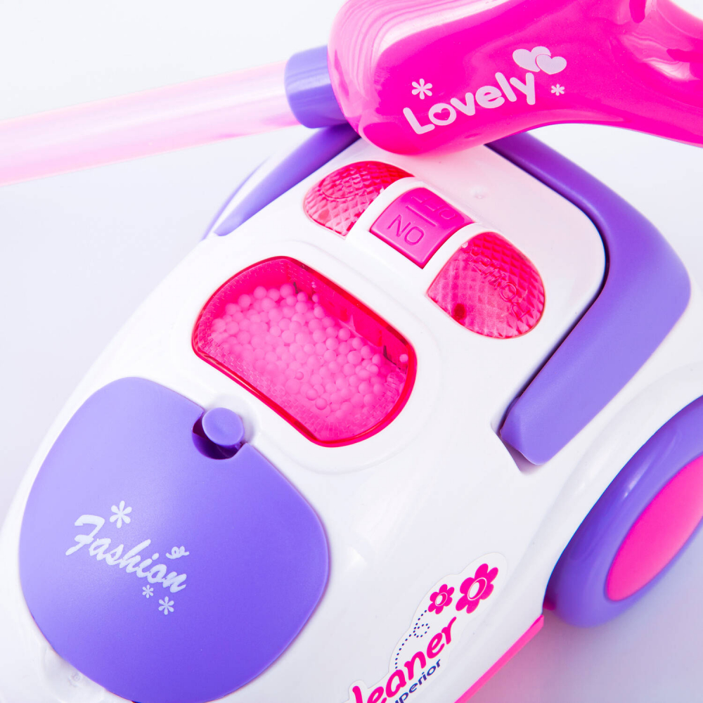* Aspirator si bile din Styrofoam - aspiratorul se aprinde, scoate un sunet imitand functionarea unui aspirator adevarat si aspira usor aer, poate aspira bilele Styrofoam incluse in set.