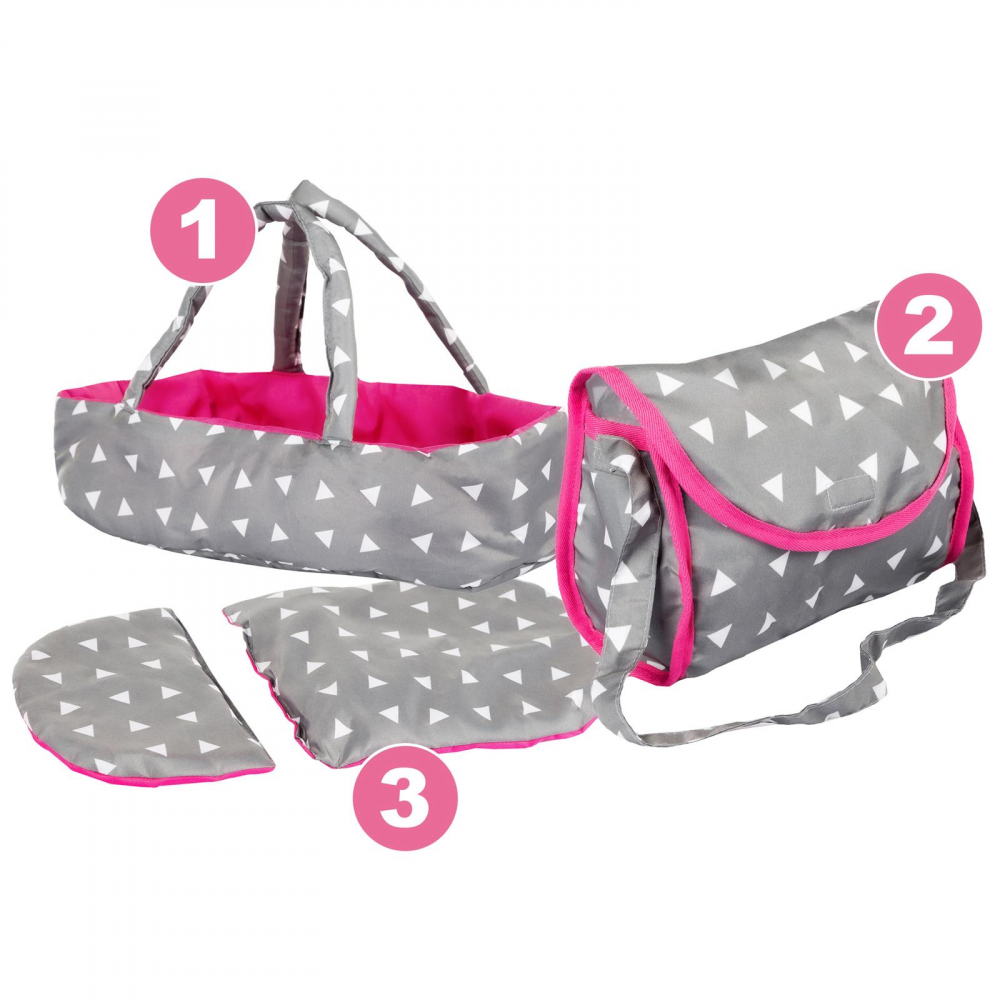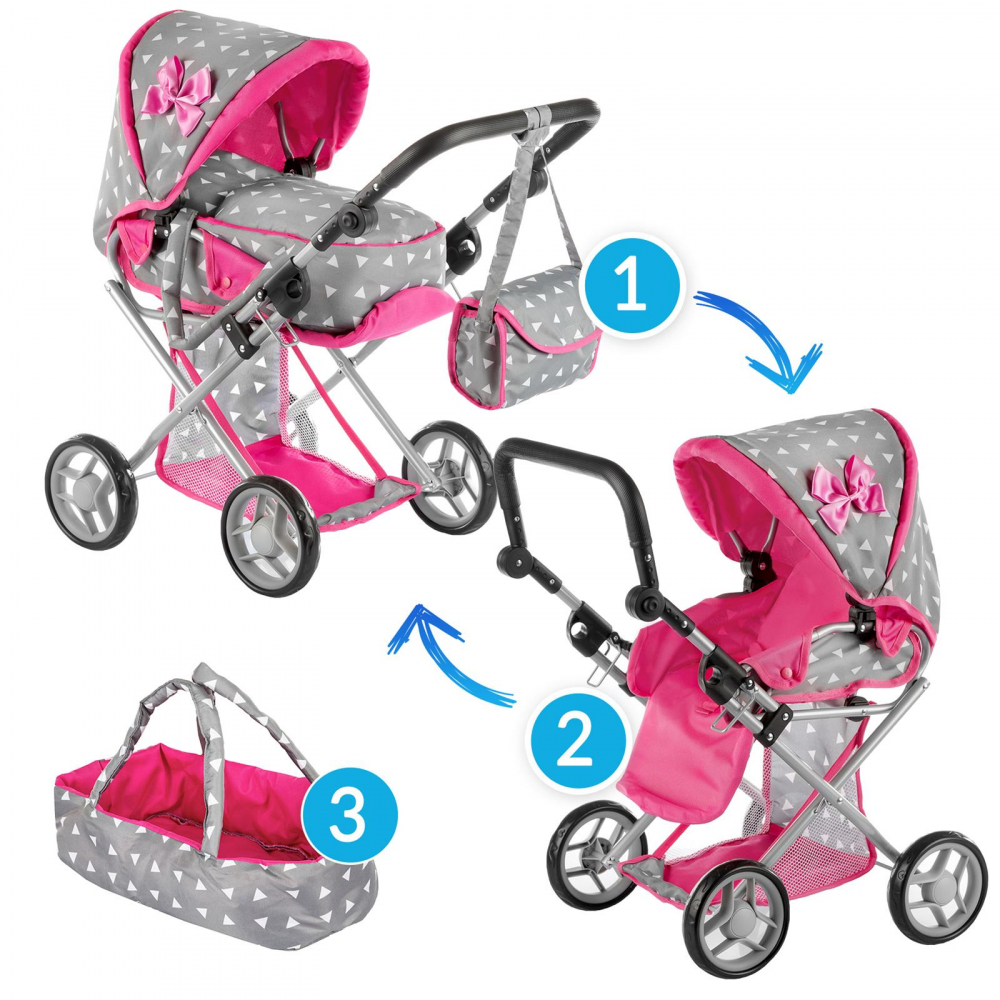 Carucior de papusi 3in1 Kinderplay, pliabil cu manerul si copertina reglabile, cos de depozitare accesorii, roti din spuma, gentuta de mana, cosulet moale pentru transport, pernuta si plapuma incluse Grey / White Triangle