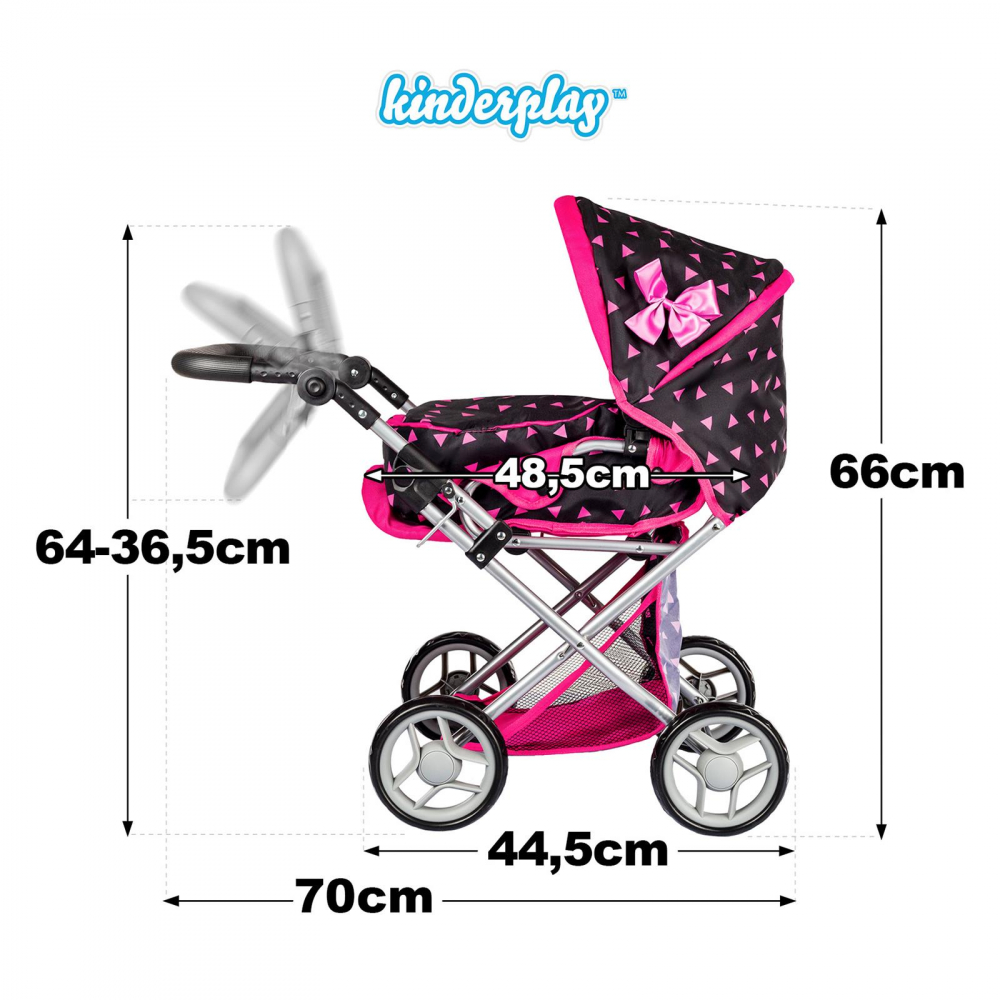 Carucior de papusi 3in1 Kinderplay, pliabil, manerul si copertina reglabile, cos de depozitare accesorii, roti din spuma, gentuta de mana, cosulet moale pentru transport, pernuta si plapuma incluse Black / Pink Triangle