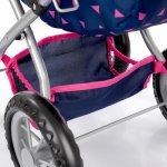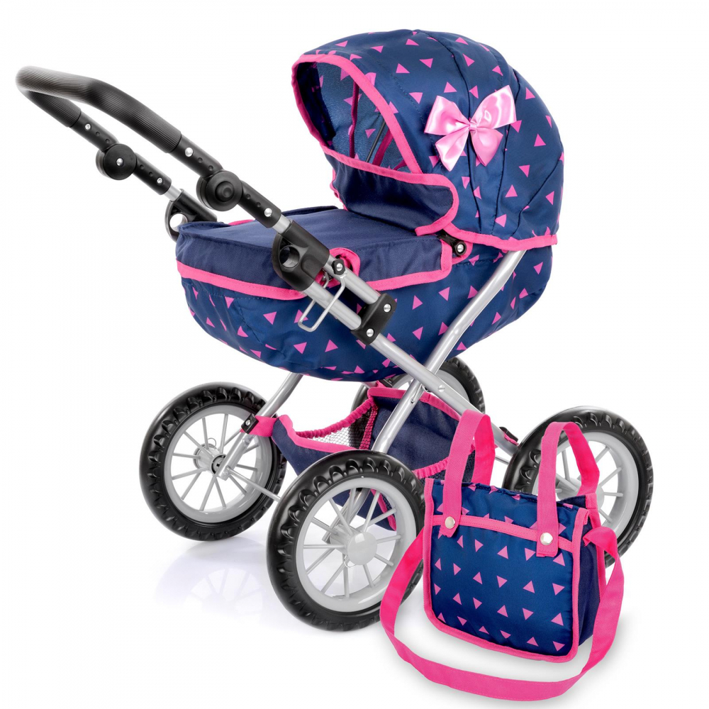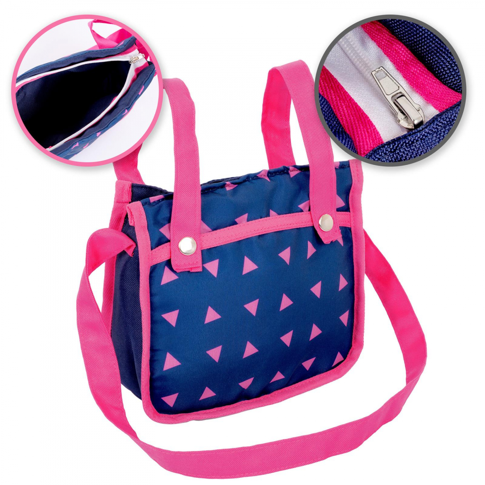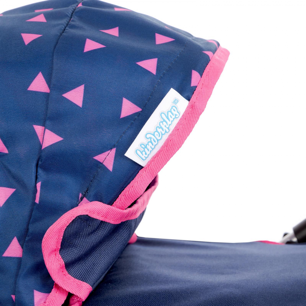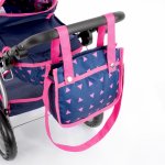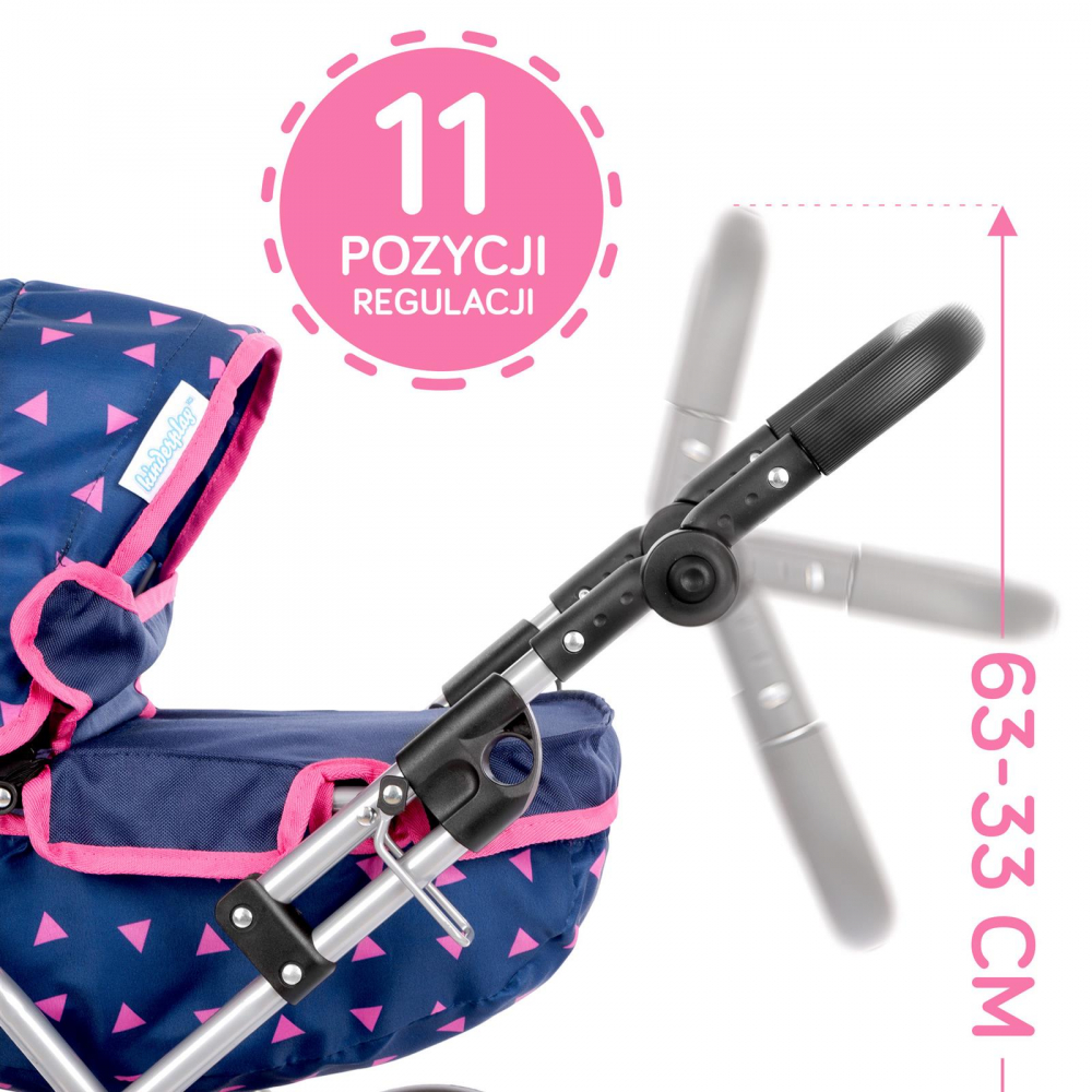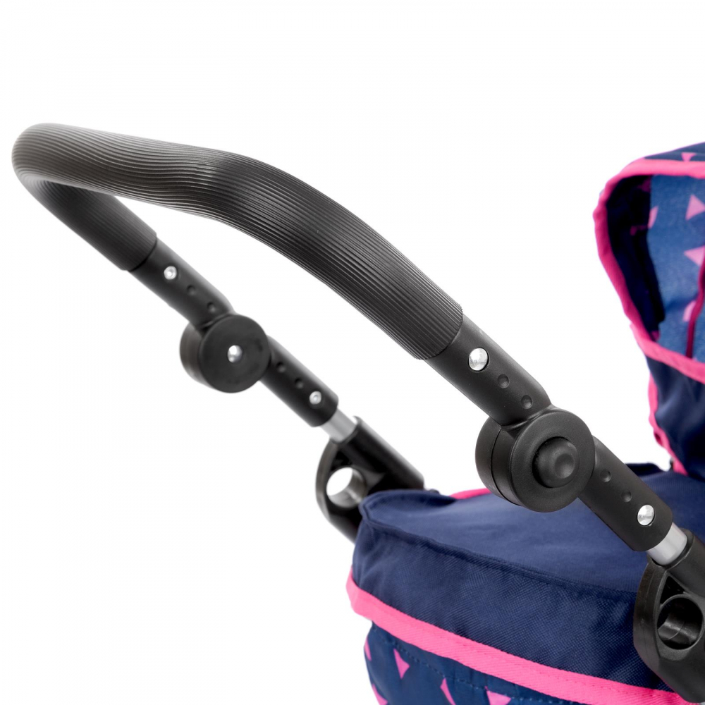 Carucior de papusi pentru copii Kinderplay, constructie solida 36 x 48 x 58cm, roti din spuma PVC, cos pentru accesorii, cu Copertina, maner reglabil si gentuta cu fermoar inclusa Blue / Pink Triangle