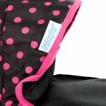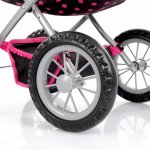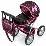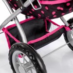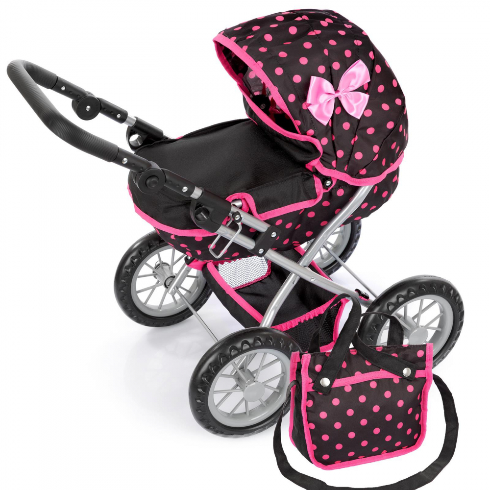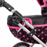 Carucior de papusi pentru copii Kinderplay, constructie solida 36 x 48 x 58cm, roti din spuma pvc, cos pentru accesorii, cu copertina, Maner reglabil si Gentuta cu fermoar inclusa Black / Pink Dots