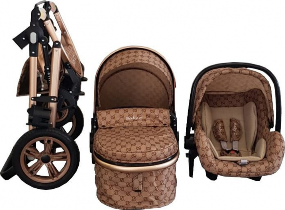 Carucior pentru copii Baby Care Pro 530 Crem cu Imprimeu Bambucci 3 in 1 Transformabil, Cadru Aluminiu, Amortizoare, Roti din cauciuc, Spatar reglabil 3 trepte, Plasa insecte, Geanta
