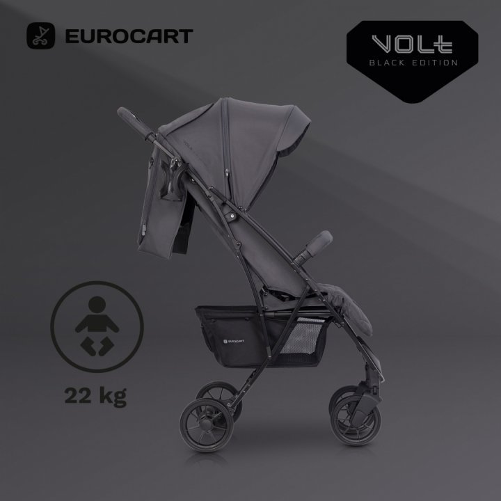 Carucior pentru copii, Euro-Cart Volt Pro, omologat pana la 22 kg, Iron Black Edition, ultracompact, pliabil cu o singura mana, spatar reglabil in 3 pozitii, roti cu suspensie