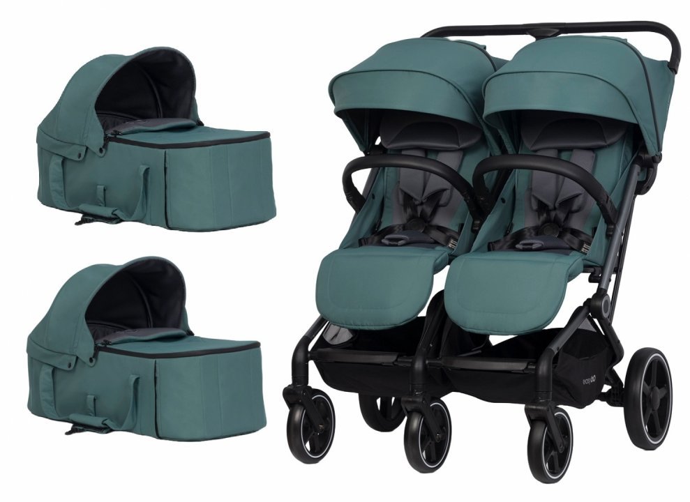 Carucior pentru copii gemeni, EasyGo Echo 2 in 1, omologat EN1888, Pliabil, cu Landouri textile, copertine independente reglabile si detasabile, suspensii, spatar reglabil, cu 2 huse de picioruse incluse, Sage Green
