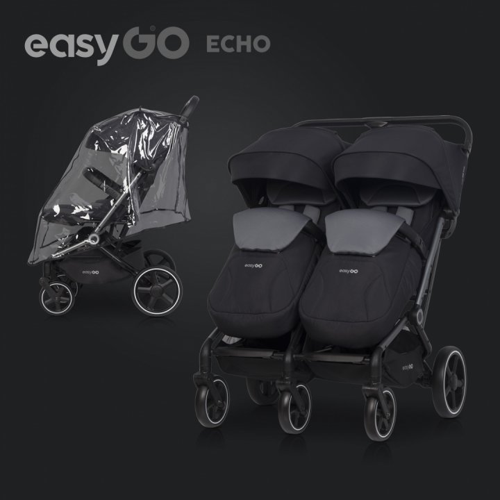 Carucior pentru copii gemeni, EasyGo Echo 2 in 1, omologat EN1888, Pliabil, cu Landouri textile, copertine independente reglabile si detasabile, suspensii, spatar reglabil, cu 2 huse de picioruse incluse, Ebony Black