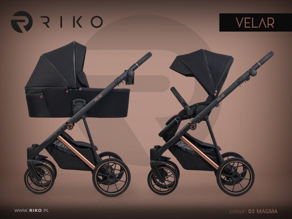 Carucior pentru copii, Riko Velar Magma Premium Line 3 in 1, omologat i-Size R129, cu suspensii, maner reglabil pe inaltime, cu scoica auto, Geanta si accesorii incluse, pana la 22 kg, Negru