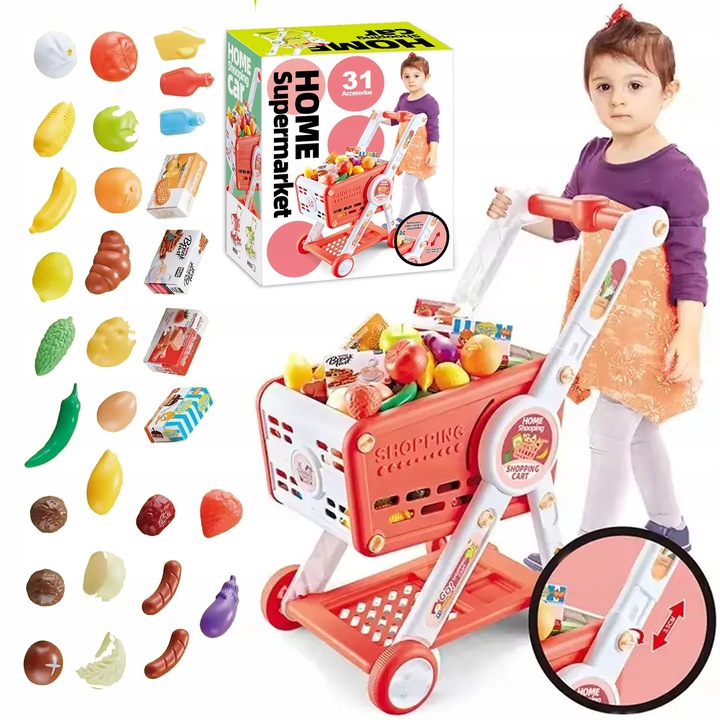 Carucior pentru cumparaturi cu inaltime reglabia si 30 accesorii Home Supermarket Pink