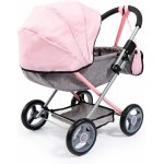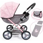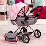 Carucior pliabil pentru papusi Anna Cosy Denim Grey/Pink cu paturica,pernuta si gentuta de umar incluse,roti mari din spuma,cadru metalic bicolor,dimensiune 63x34x58 cm