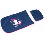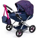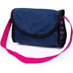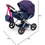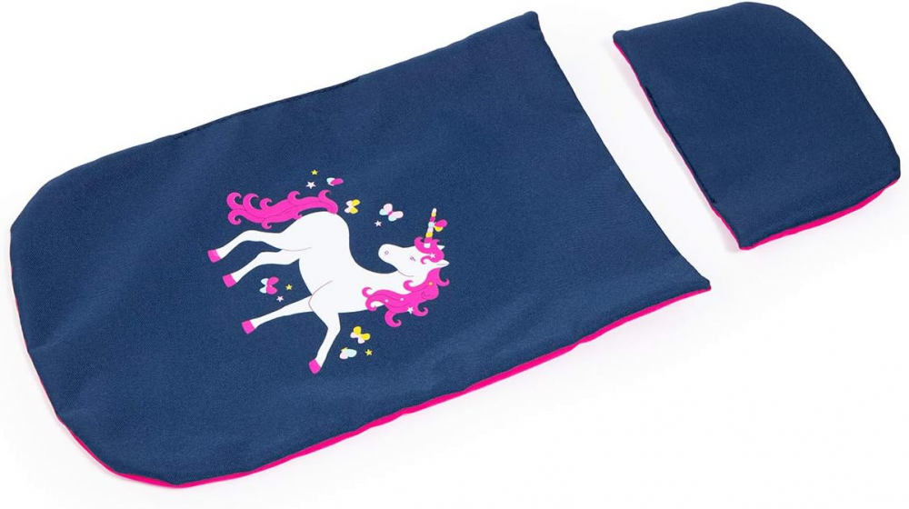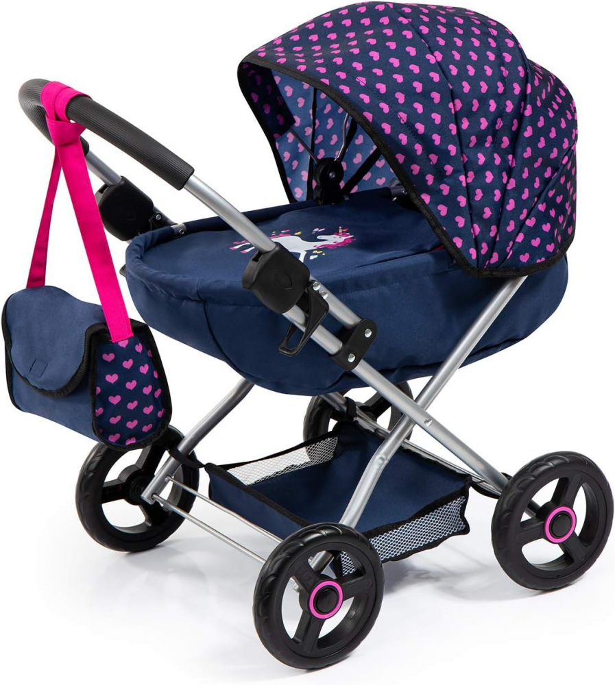 Carucior pliabil pentru papusi Anna Cosy Pink Unicorn Blue cu paturica,pernuta si gentuta de umar incluse, roti mari din spuma, cadru metalic bicolor, dimensiune 63x34x58 cm