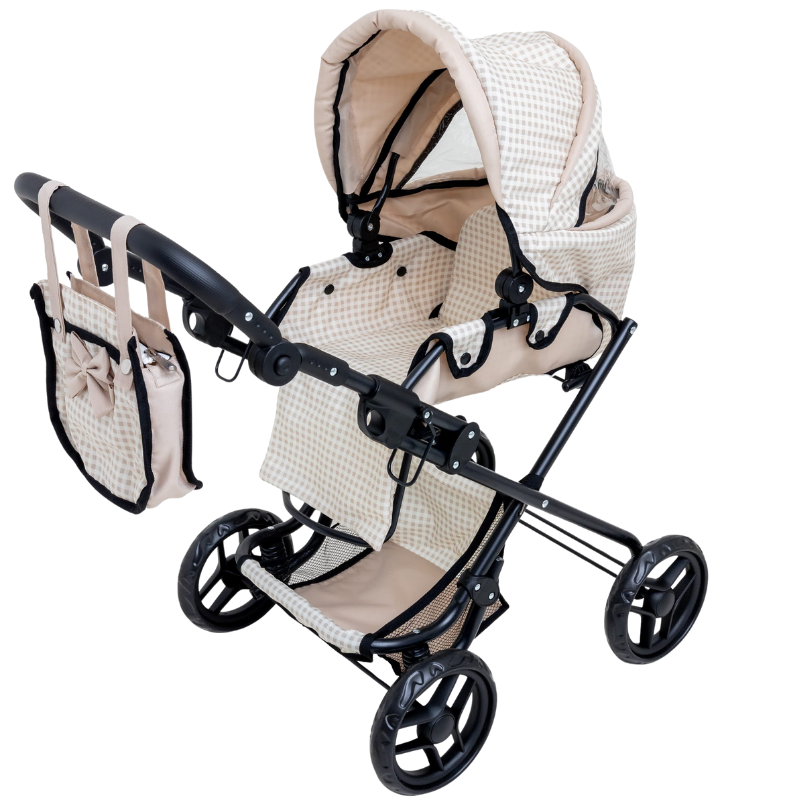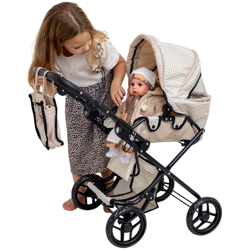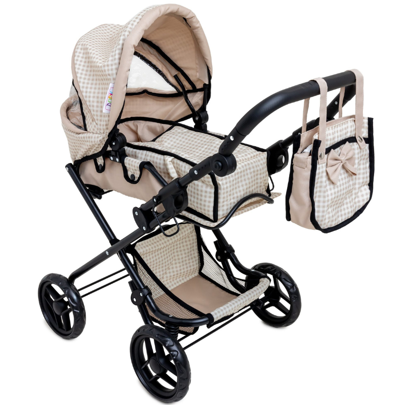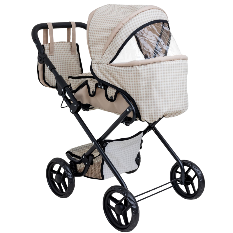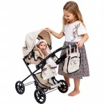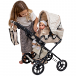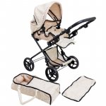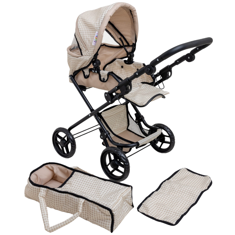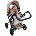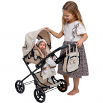 Carucior pliabil pentru papusi Doris Beige 2in1 cu maner reglabil,copertina cu fereastra,saltea de infasat,landou portabil cu manere,gentuta accesorii,roti din spuma eva,cos accesorii,dimensiune