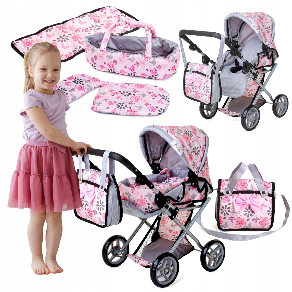 Carucior pliabil pentru papusi Doris Flower 2in1 cu maner si copertina reglabile,saltea de infasat,landou portabil cu manere,gentuta accesorii,roti din spuma eva,cos accesorii,dimensiune 74x36x70 cm