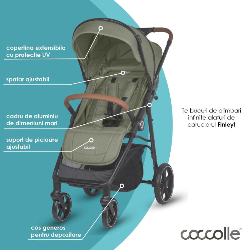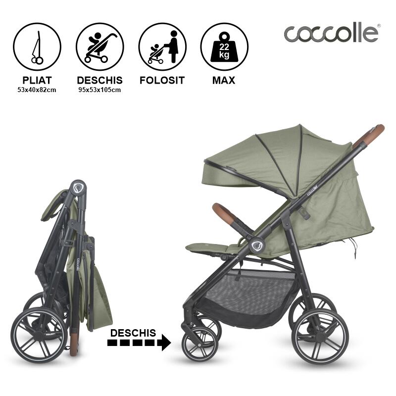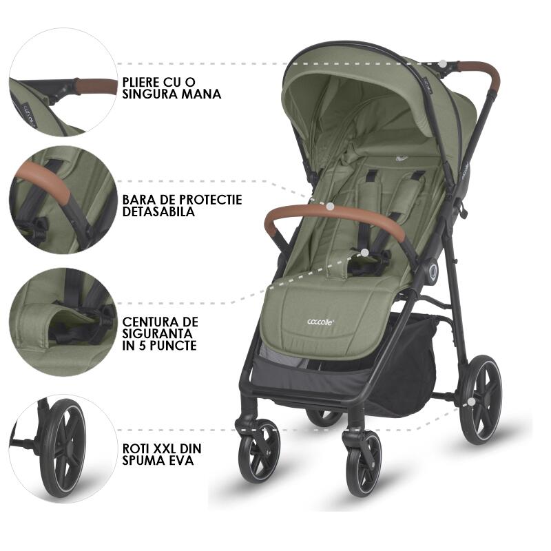 Carucior sport Coccolle Finley cu pliere automata, pozitie de somn , roti detasabile, spatar reglabil, centura de siguranta in 5 puncte, extensibila cu ventilatie, husa picioruse, sarcina maxima 22 kg, Moss Green