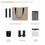 Caruciorul Kinderkraft YOXI SAND BEIGE este insotit de un set de accesorii practice precum plasa impotriva insectelor, husa de ploaie, suportul pentru pahar, geanta pentru parinte si adaptoarele pentru scaunul auto.