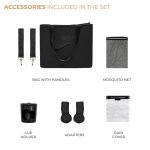 Caruciorul Kinderkraft YOXI BLACK este insotit de un set de accesorii practice precum plasa impotriva insectelor, husa de ploaie, suportul pentru pahar, geanta pentru parinte si adaptoarele pentru scaunul auto.