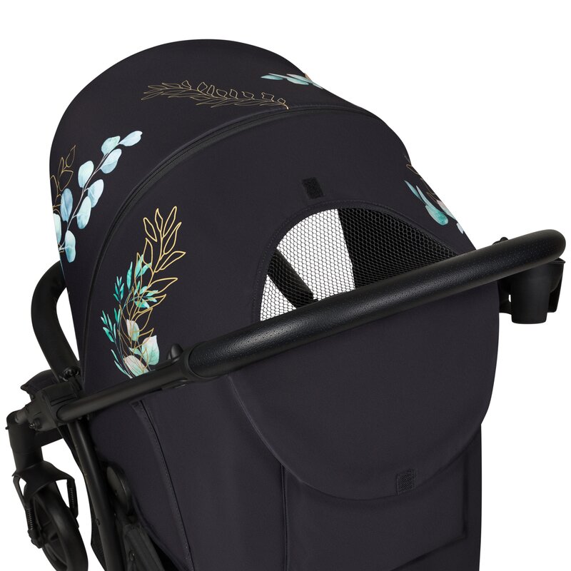 Accentele aurii au fost aplicate manual, facand fiecare carucior unic. Intre timp, tesatura in sine a fost imbogatita cu un strat hidrofug pentru a-l proteja si mai mult pe cel mic de ploaie.