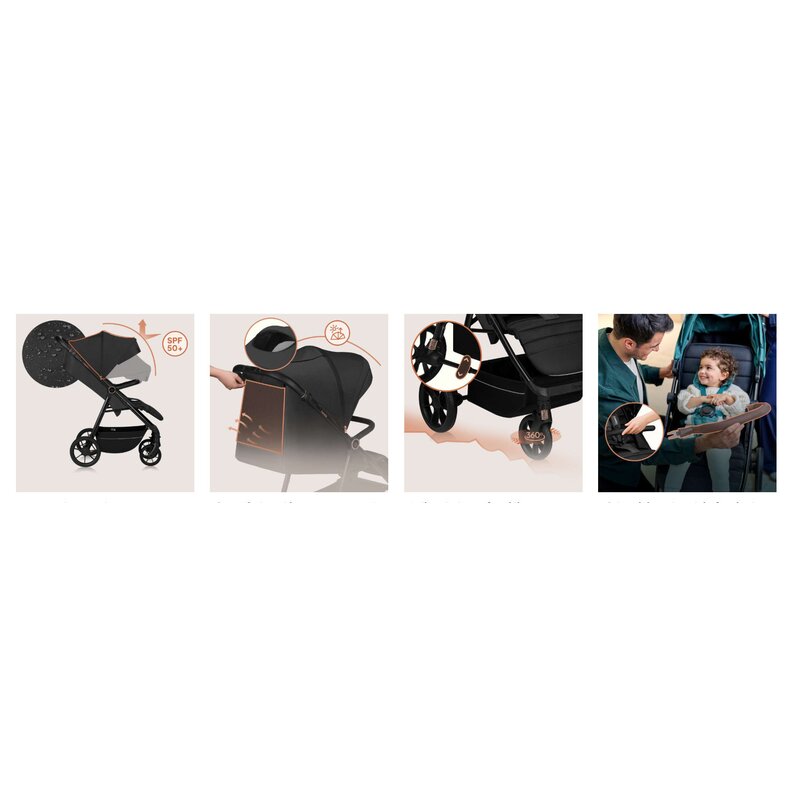 Confortabil atat pentru cei mici, cat si pentru ingrijitori. Ideal pentru plimbari urbane si foarte usor de manevrat datorita rotilor mari, care nu necesita intretinere – poate fi folosit si in afara drumului.