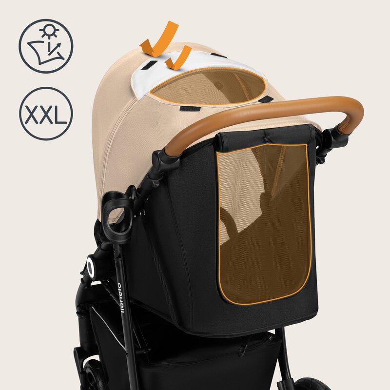 Caruciorul Lionelo Natt are o capotina xxl echipata cu filtru UPF50+ pentru a-l proteja pe cel mic de conditii meteorologice schimbatoare.
