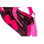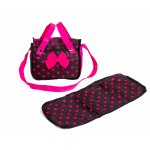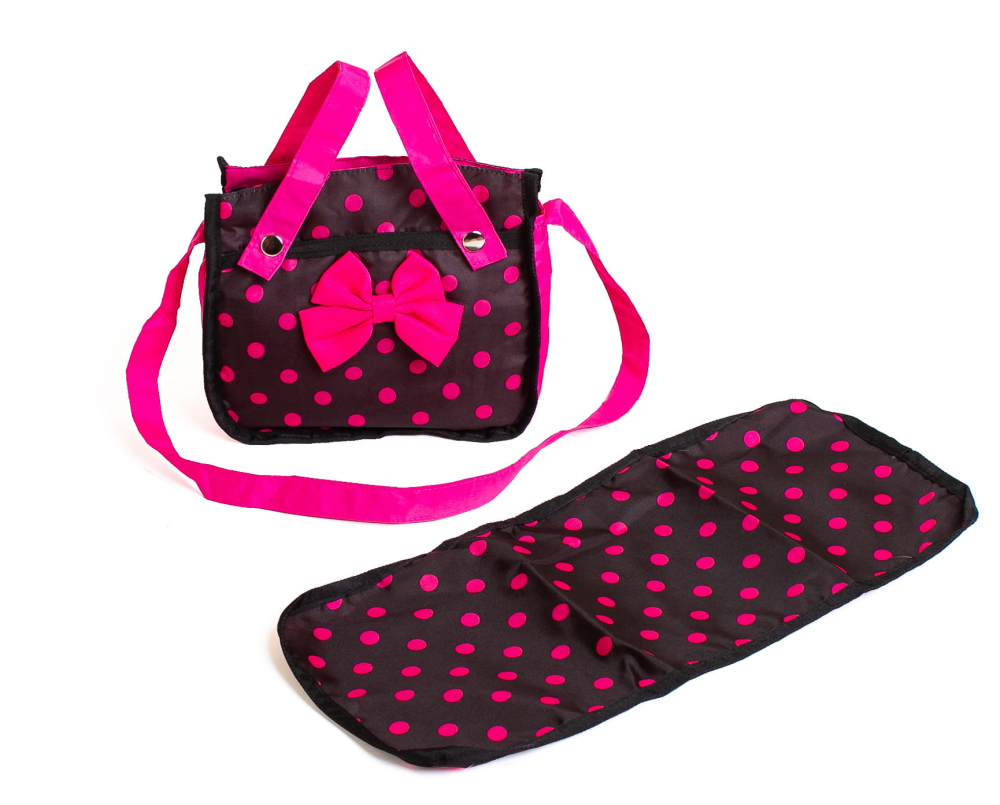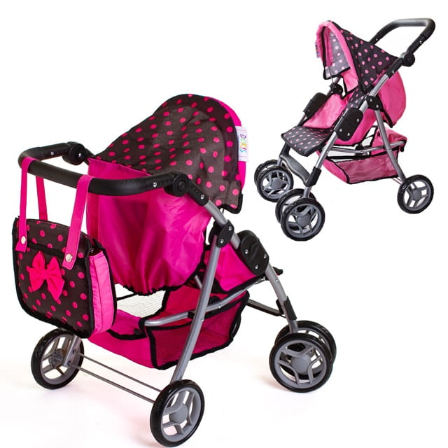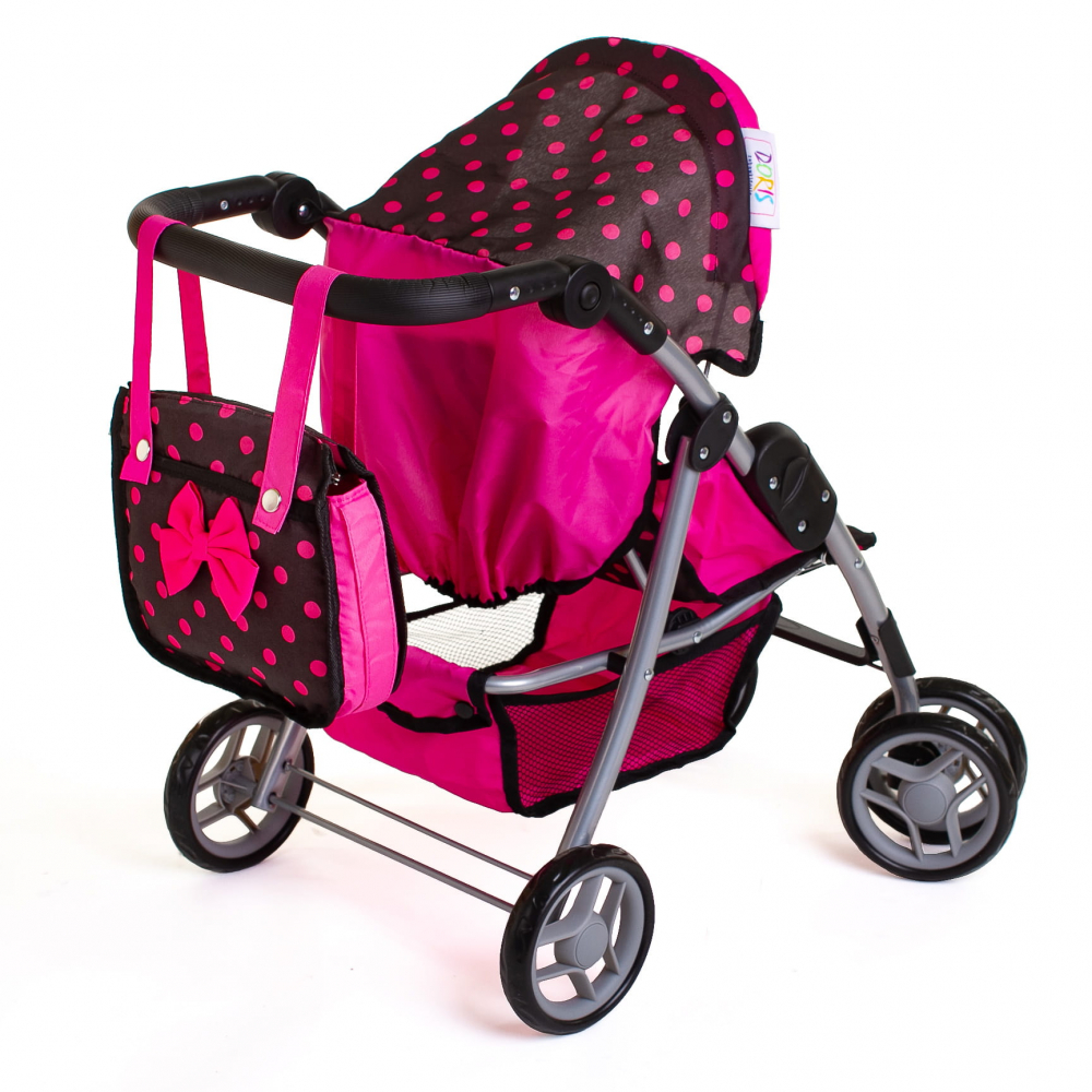 Carucior sport pentru papusi Doris cu gentuta si salteluta infasat Negru bulinute Roz