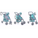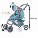 Carucior sport pentru papusi Doris Turcoaz/Gri bulinute albe cu maner reglabil pe inaltime, Capotina ,Spatar reglabil, Cadru din aluminiu,Roti EVA pivotante si silentioase,Cos de cumparaturi,Centura de siguranta,Husa lavabila