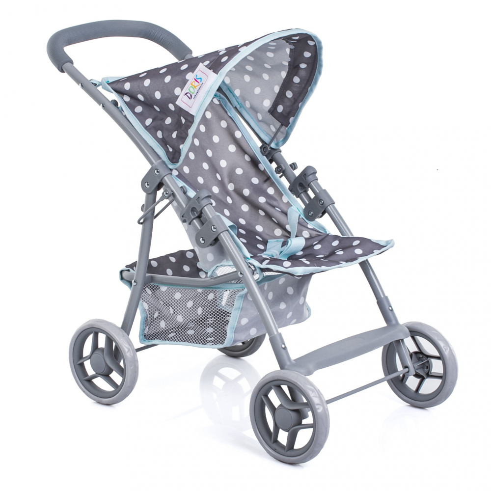 Carucior sport pentru papusi Doris Turcoaz/Gri bulinute cu Roti din spuma EVA,Cadru din aluminiu pliabil,Copertina,Cos pentru accesorii,Centuri de siguranta,Siguranta impotriva plierii accidentale,Husa detasabila si lavabila